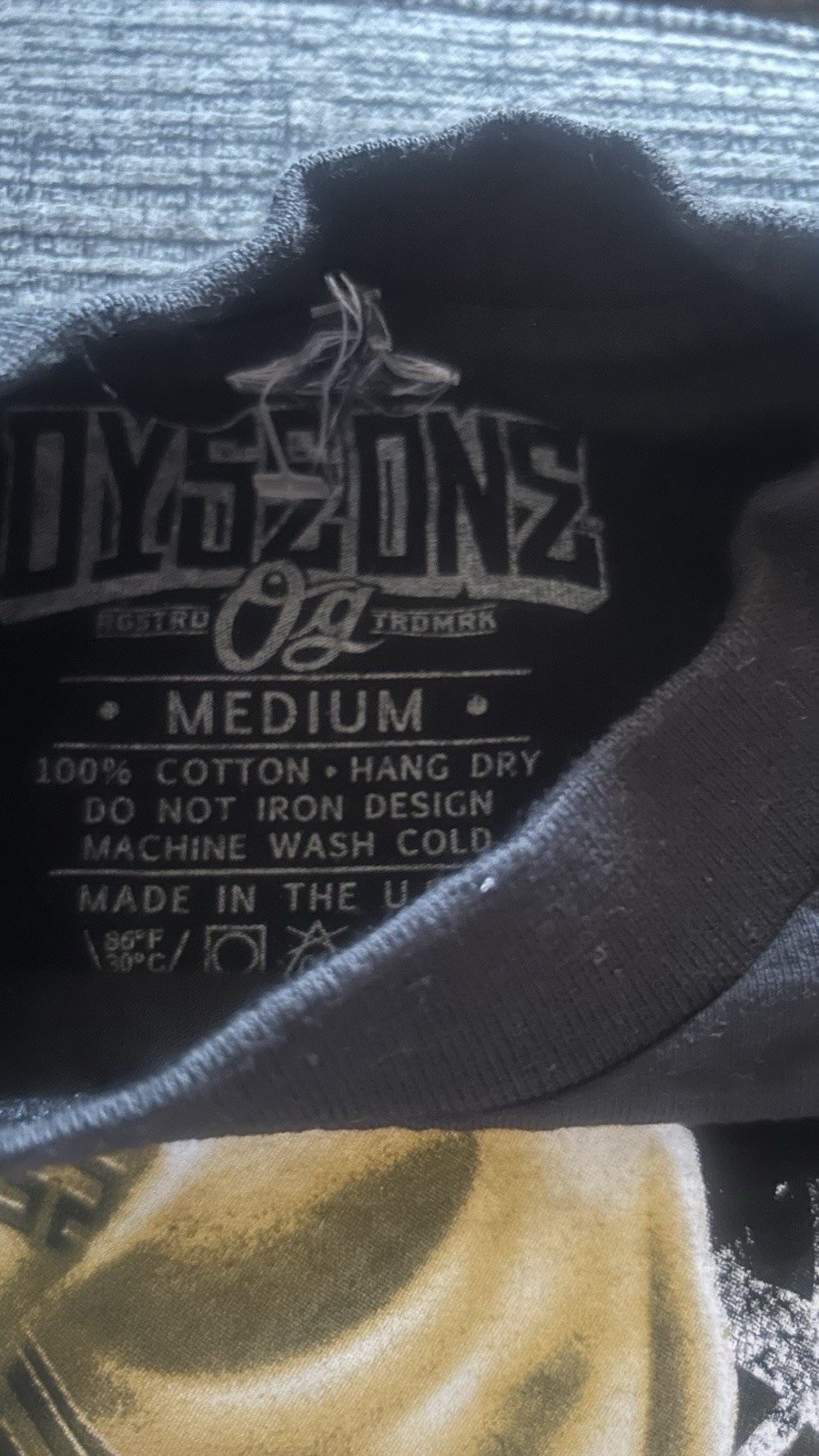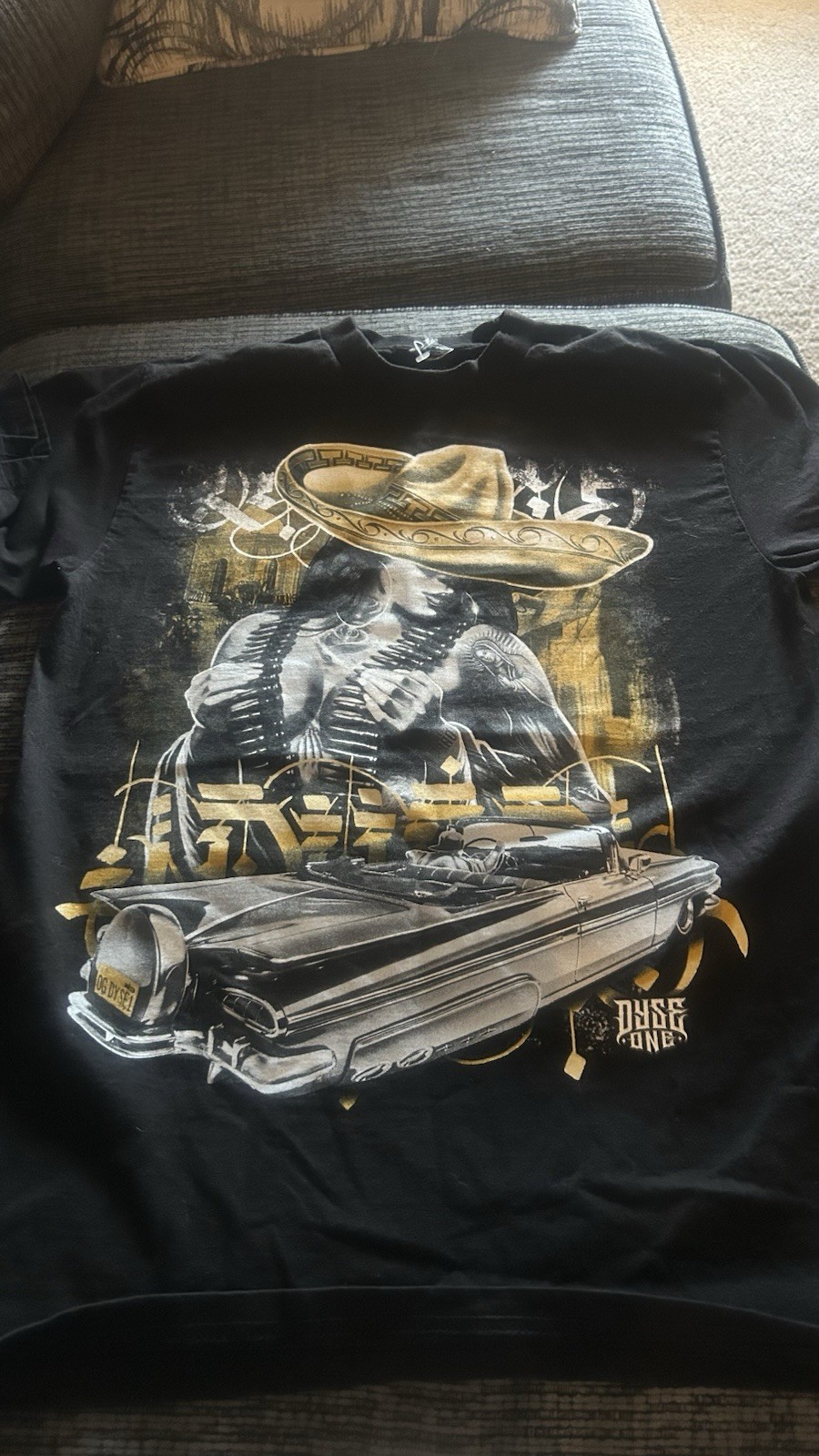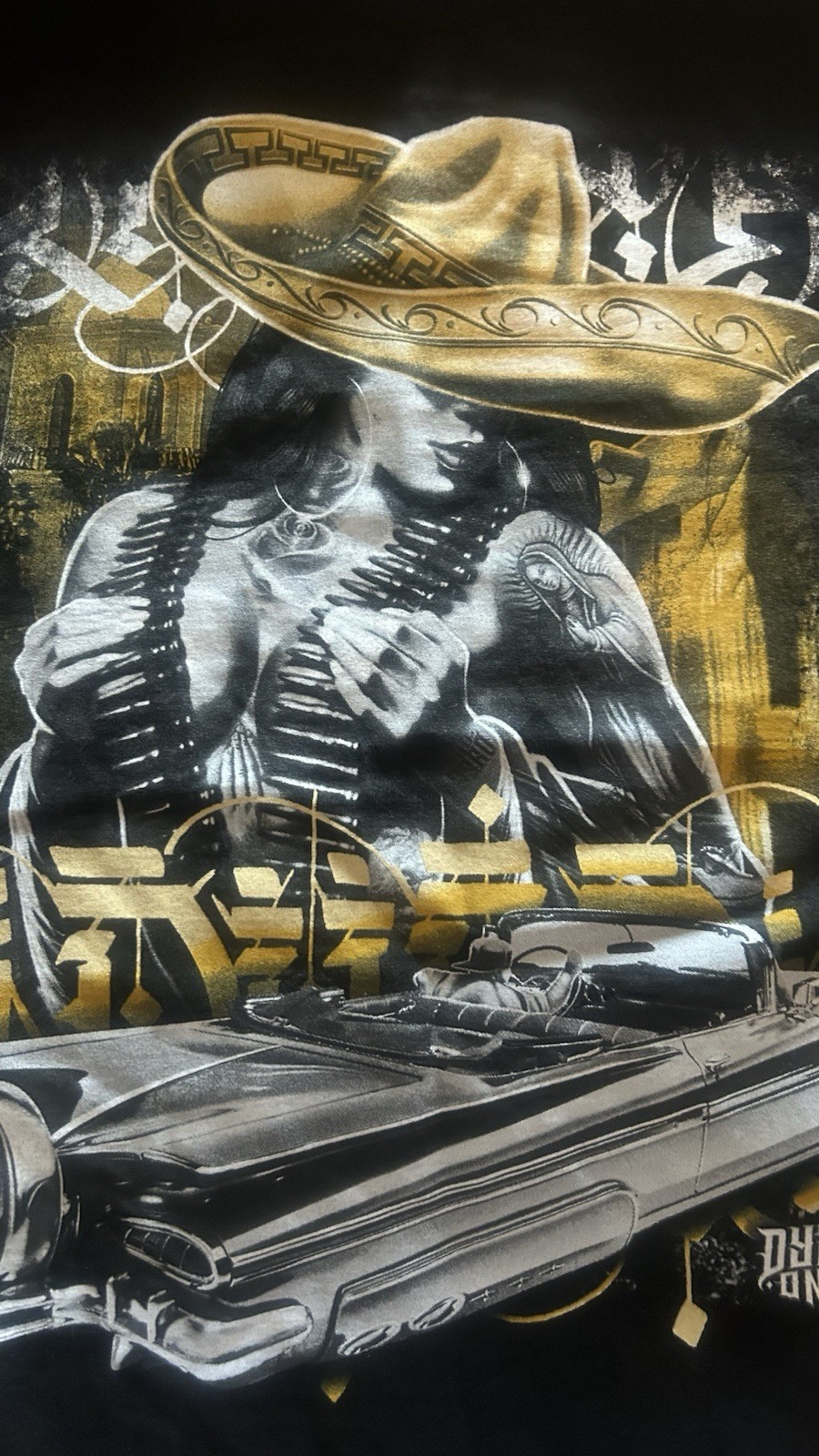 The DyseOne Collectable Woman with Sombrero Lowrider T-Shirt is a unisex graphic tee with a round neckline and short sleeves, made of black cotton in size M. The shirt features a graphic print of a woman with a sombrero, perfect for those looking to show off their style. This regular fit shirt is designed by the brand DyseOne and is proudly manufactured in the United States, offering a comfortable and stylish option for both men and women.