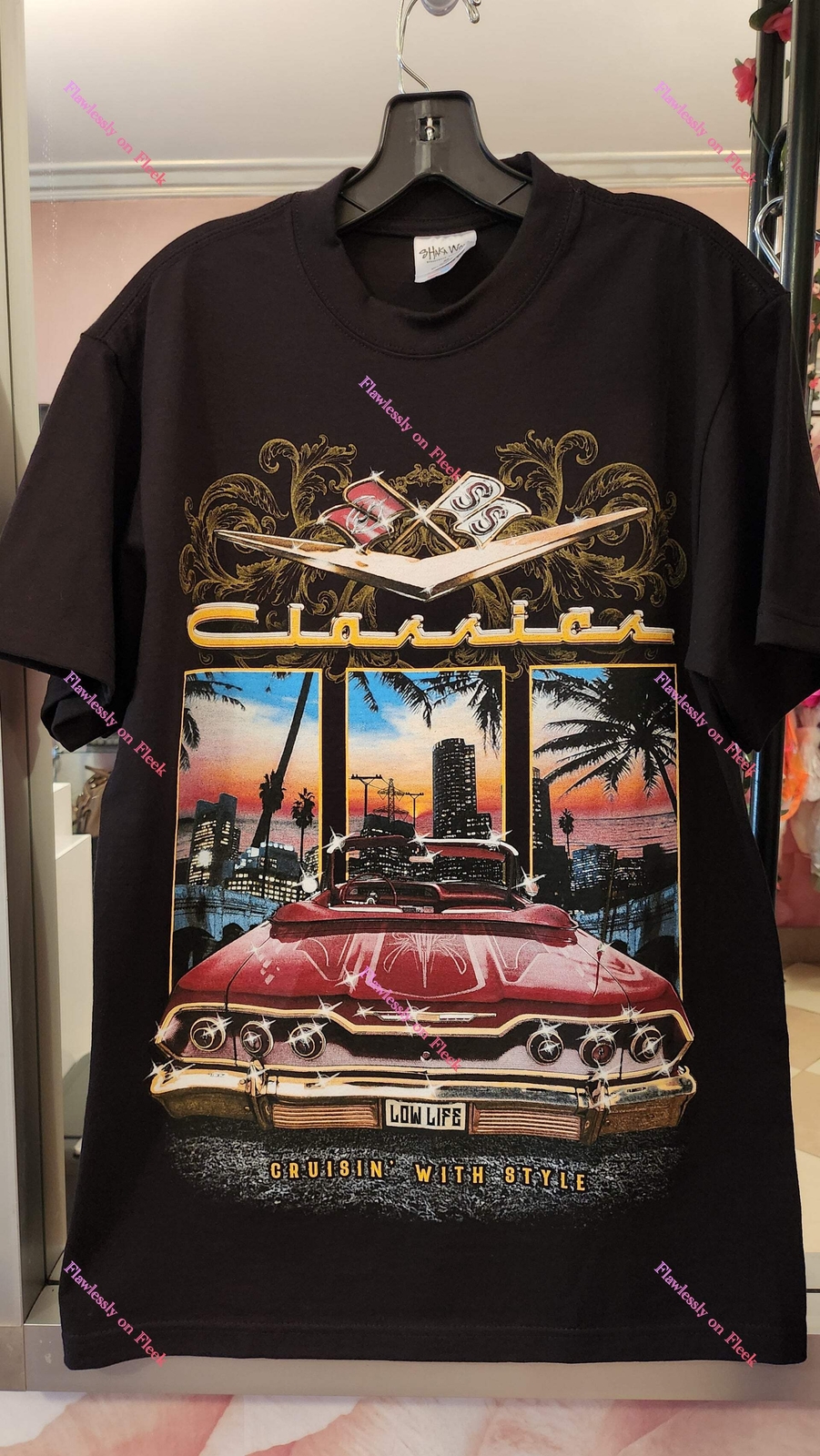 Lowrider Classic Cruisin with Style Graphic T-Shirt Introducing the Lowrider Classic Cruisin with Style Graphic T-Shirt, the perfect addition to any wardrobe. This shirt features a unique double-sided graphic design, showcasing the iconic lowrider car in all its glory.