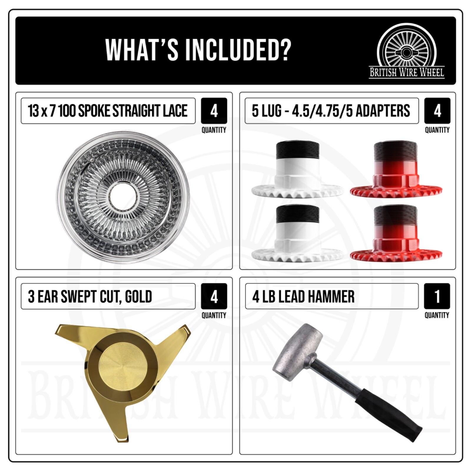 Introducing British Wire Wheel’s 13 x 7 Reverse 100 Spoke Straight Lace Wire Wheels with 3 Ear Swept/Sharkfin Style Cut Spinner Caps. The wheels are triple chrome plated, and the caps are 24K triple gold plated, providing a durable and stunning mirror-like finish. Designed to fit a wide range of vehicles, these wire wheels are a versatile choice for lowriders and classic car enthusiasts seeking a perfect blend of style and functionality.