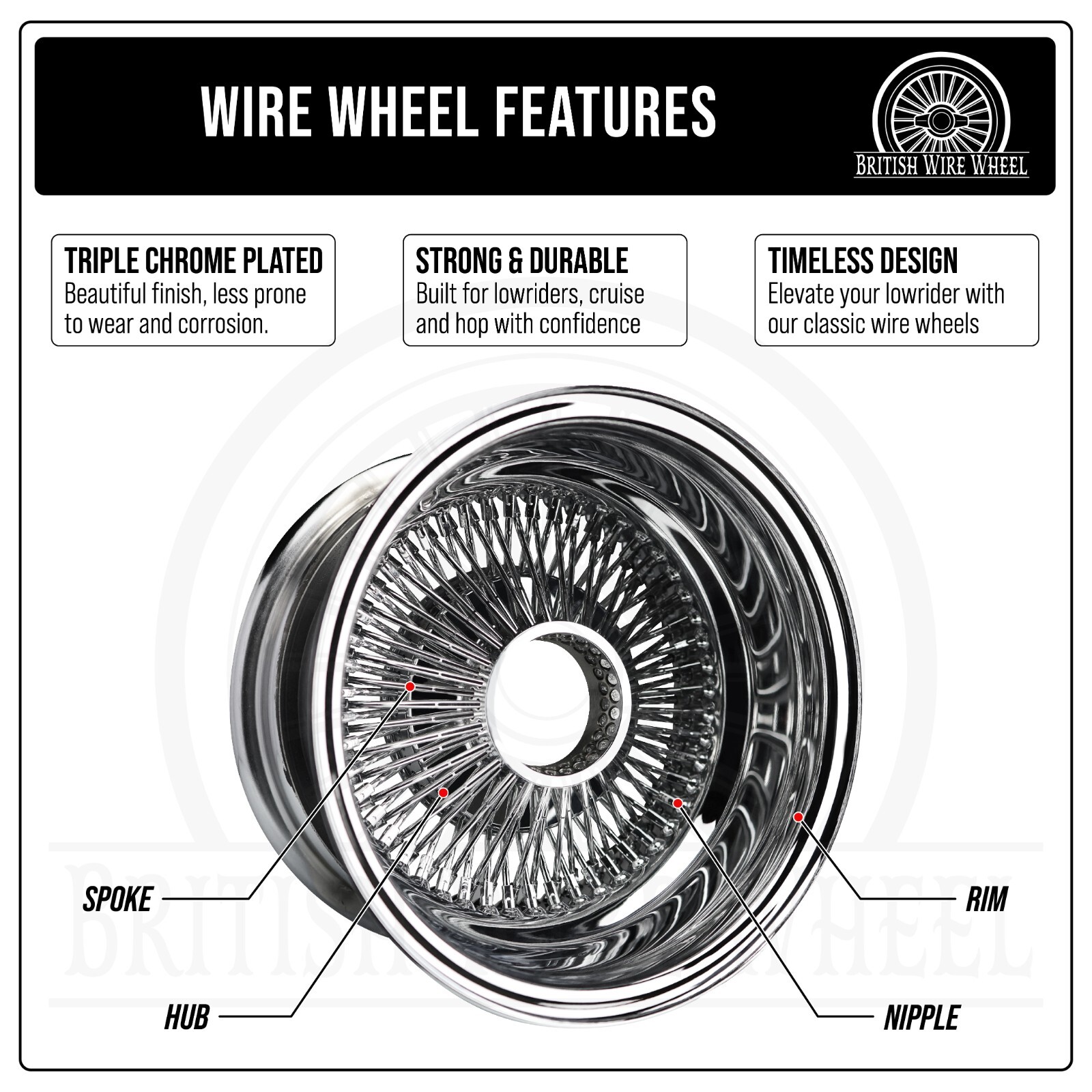 DESIGNED FOR THE LOWRIDER COMMUNITY. Designed to fit a wide range of vehicles, these wire wheels are a versatile choice for lowriders and classic car enthusiasts seeking a perfect blend of style and functionality.