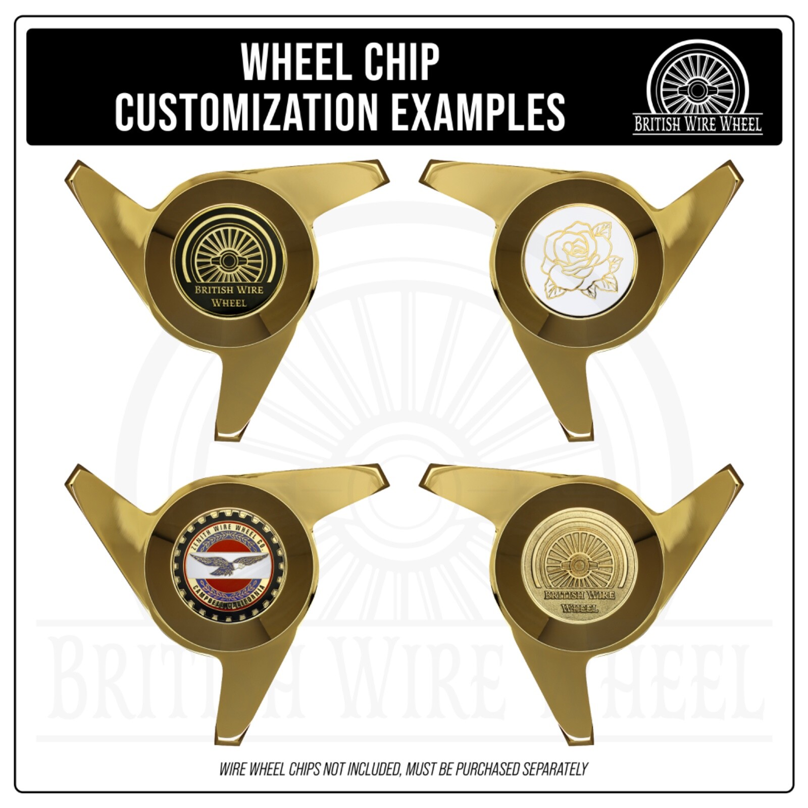This spinner cap style has a recessed/cut center that offers the opportunity to add wire wheel chip emblems, allowing for personalization and customization options not found in other knock-off styles – caps are compatible with wire wheel chips 2.25” (57 mm) in diameter.