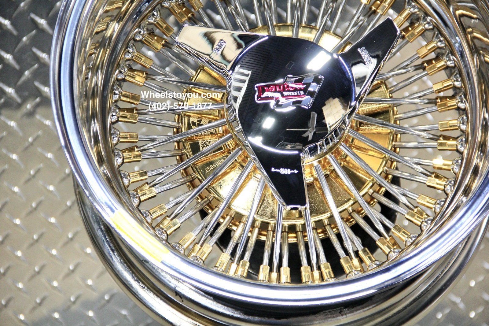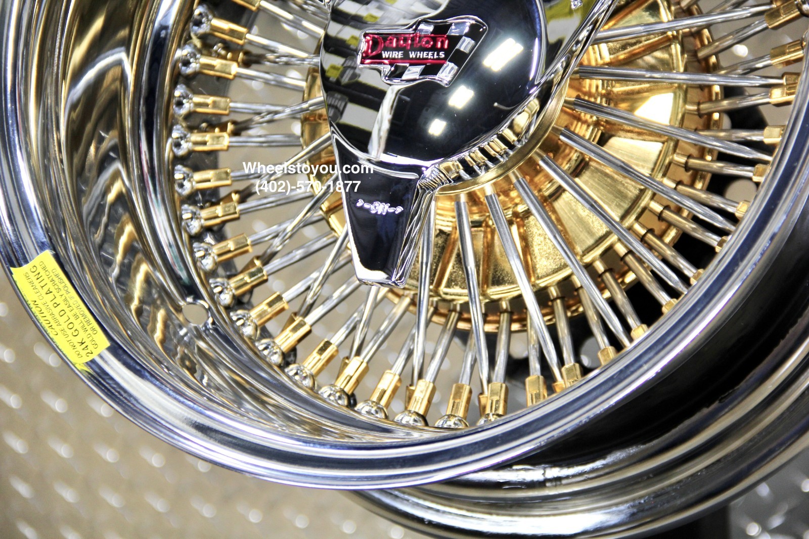 Home / Shop / Car Accessories / Wheels / 13x7 / 24kt Gold Genuine Dayton Stamped 13×7″ 72 Spoke Lowrider Wire Wheels New Set of4