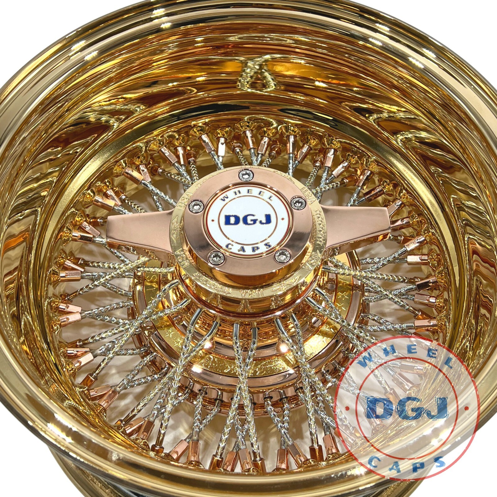 4 – Zenith Inspired 13×7 Lowrider Wire Wheel Rims. Rose Gold : Nipples +Hub 4 – Zenith Locking Inspired Knockoff Spinners. Cross Lace. Rose Gold Plated. Gold: Dish + Hub Ring. Gold Rings. White, Blue & Red on Gold (may change style, subject to availability).