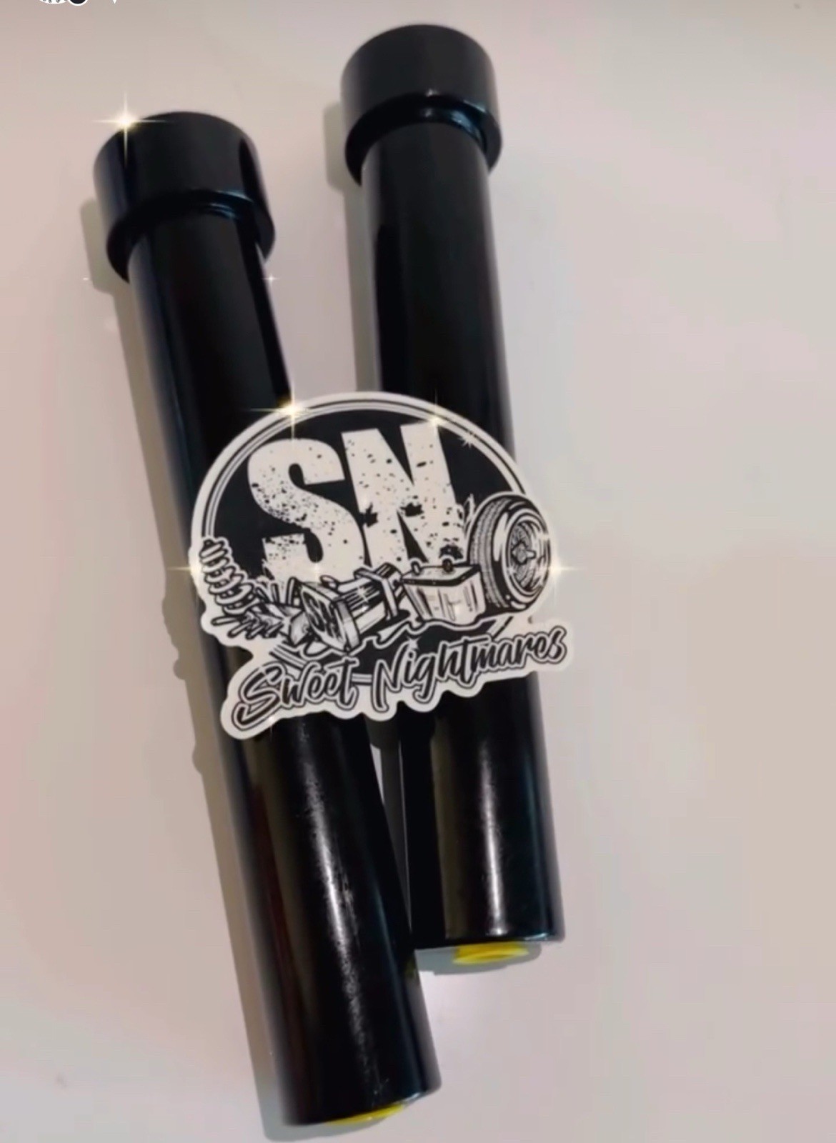 The product is a set of 8" black cylinders (2pcs) designed for direct replacement in a vehicle's chassis, suspension, and brakes. These performance parts are specifically located on the left, front, and right sides of the vehicle. The cylinders are hydraulic in nature and come with included hardware for easy installation. With no warranty available, it is important to ensure proper fitment and performance before installing these adjustable components.