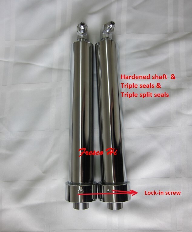 1) A pair of 8″ cylinders (FAT), with a lock-in screw to secure the cap, blew proof, hardened shaft, triple seals O rings & split O rings, chrome, the cast of cylinder diameter is 1-5/8″. The gross length is 11.75 inches when the cylinder collapse. It can be extended 8″.
