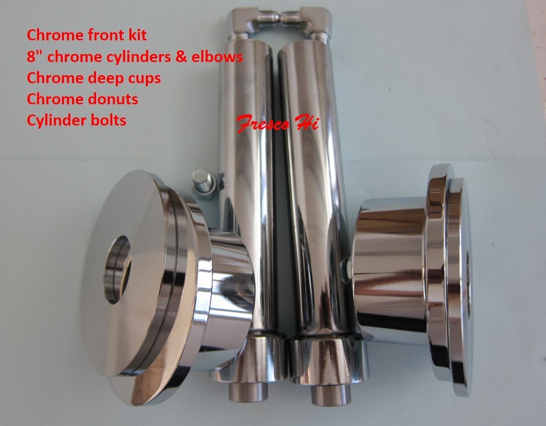 You are bidding for a chrome front kit: a pair of chrome 8″cylinders (FAT), chrome & deep cup & donuts with two elbows, 3/8″ to #6jic and bolts. It best equipped with triple seal o rings and are extremely durable and beautiful, and it will simply enhance your hydro system. Our products have been regarded very attractive and top-quality products by many users. The kit includes the following: