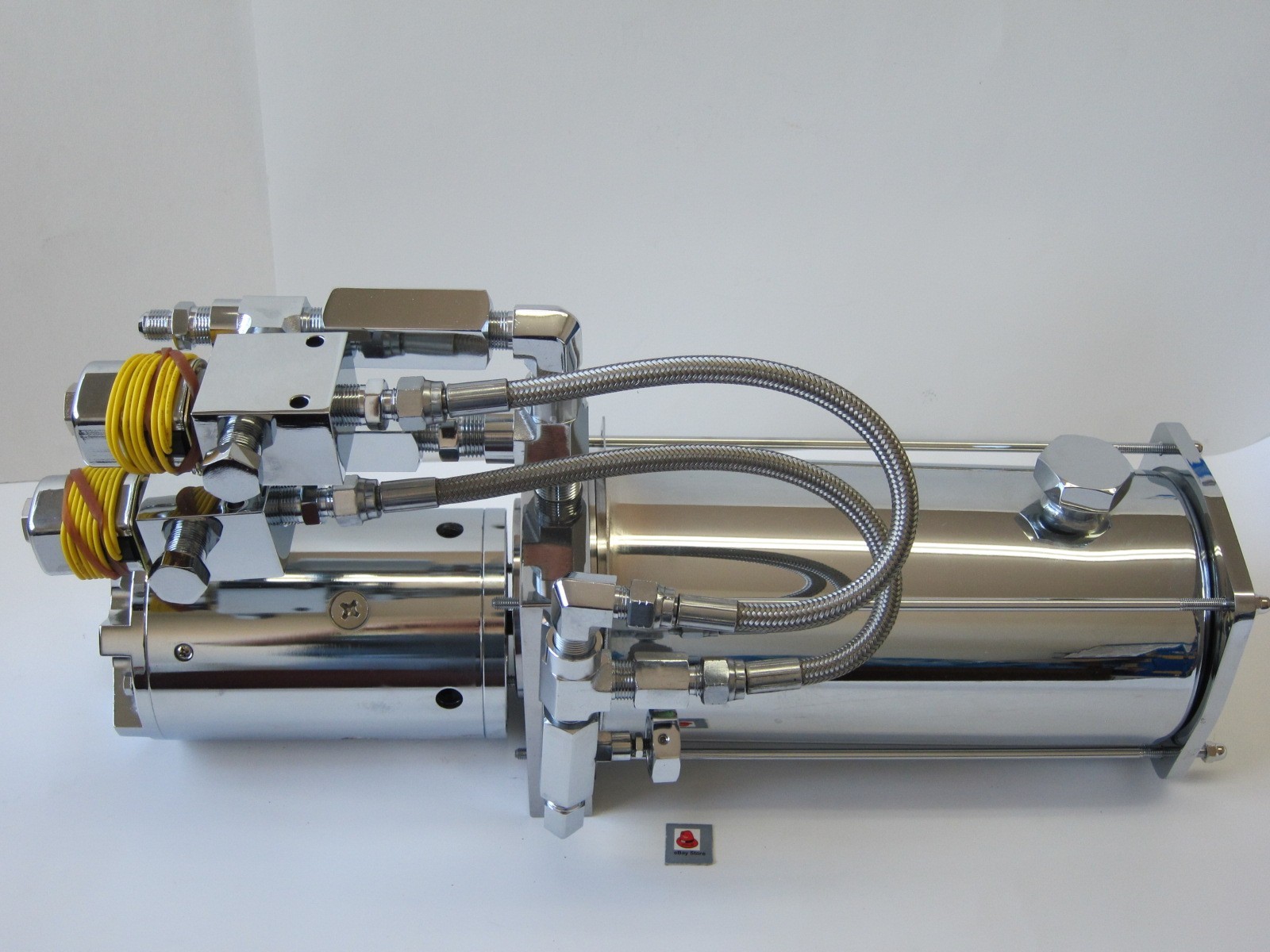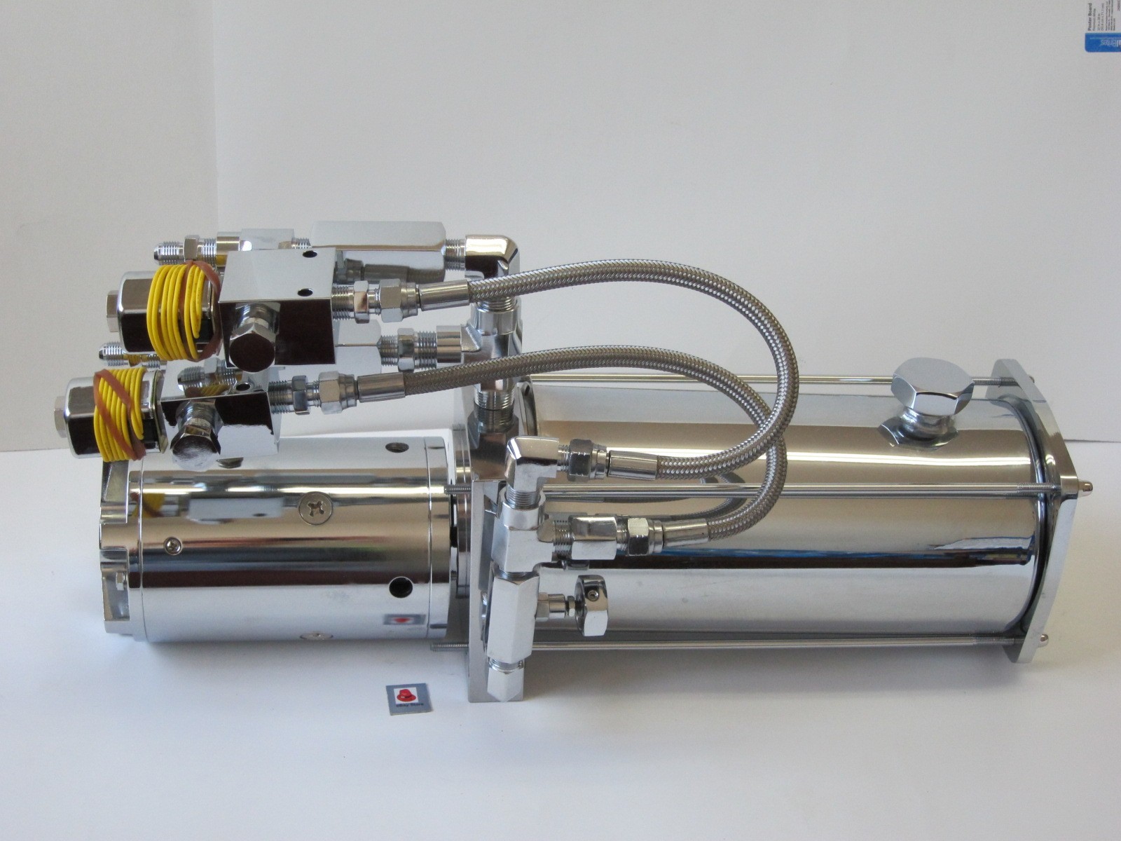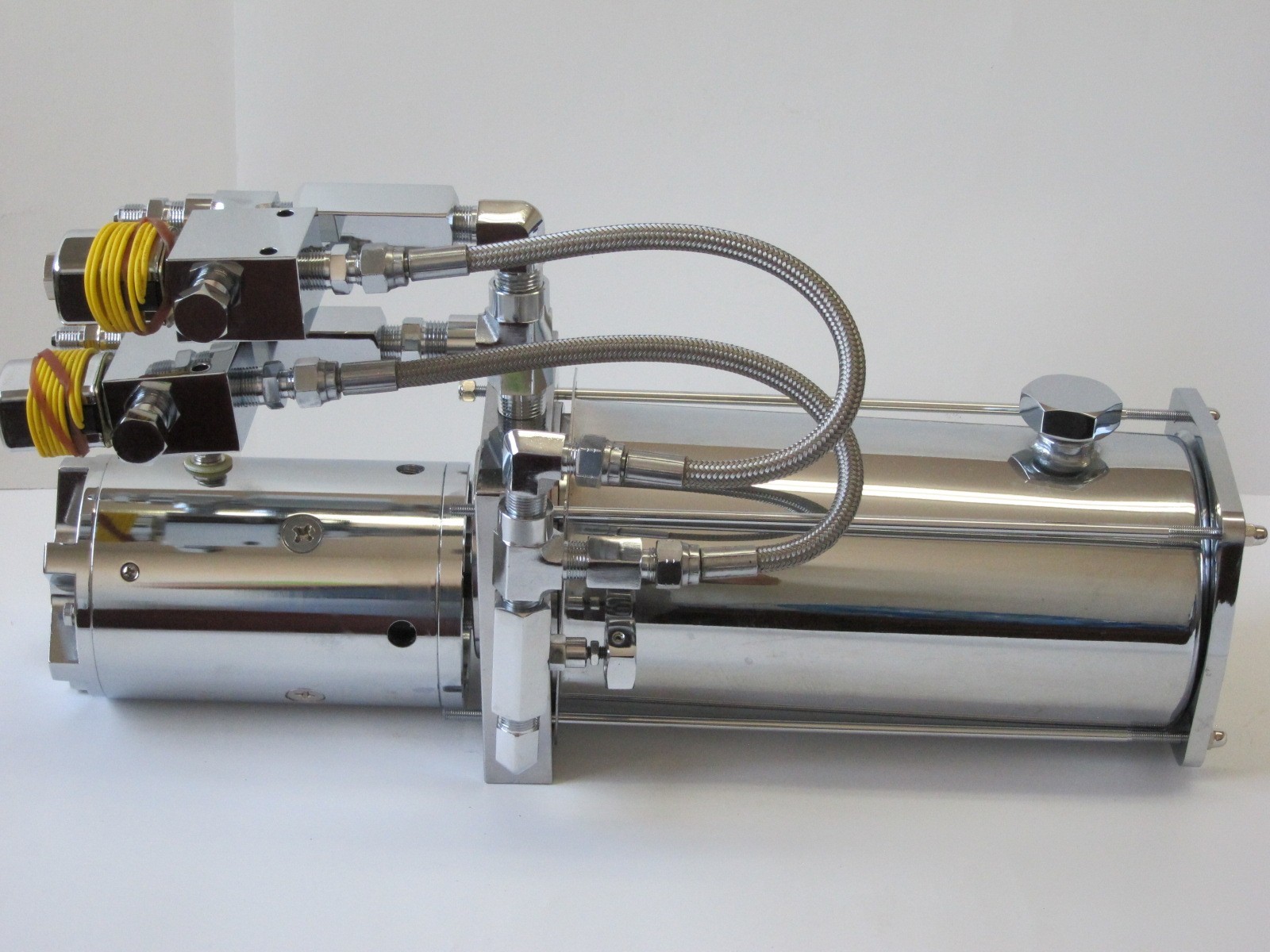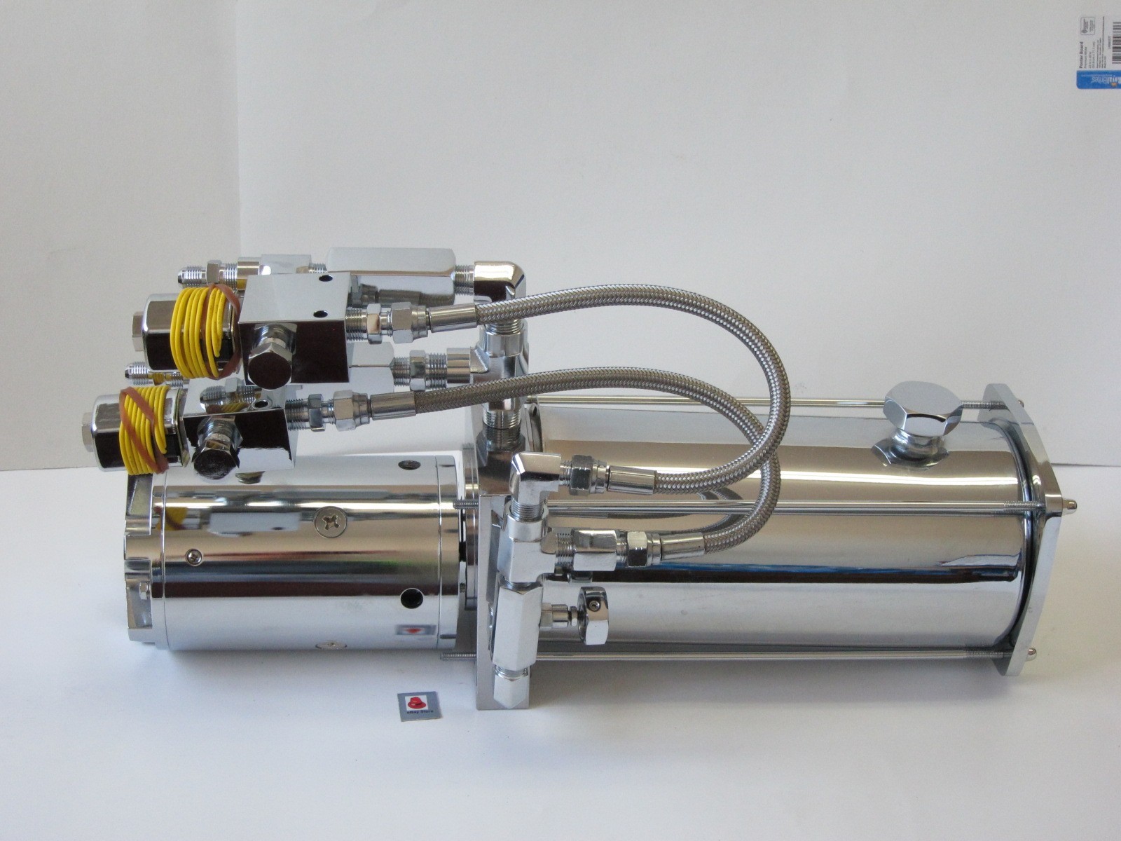 You are bidding for single pump setup kit polished block, chrome plate, dump, and chrome-finished fittings and check valves. This pump set is equipped with a reservoir tank which hold more liquid and is great for telescopic cylinders or super fat cylinders. The kit includes the following: