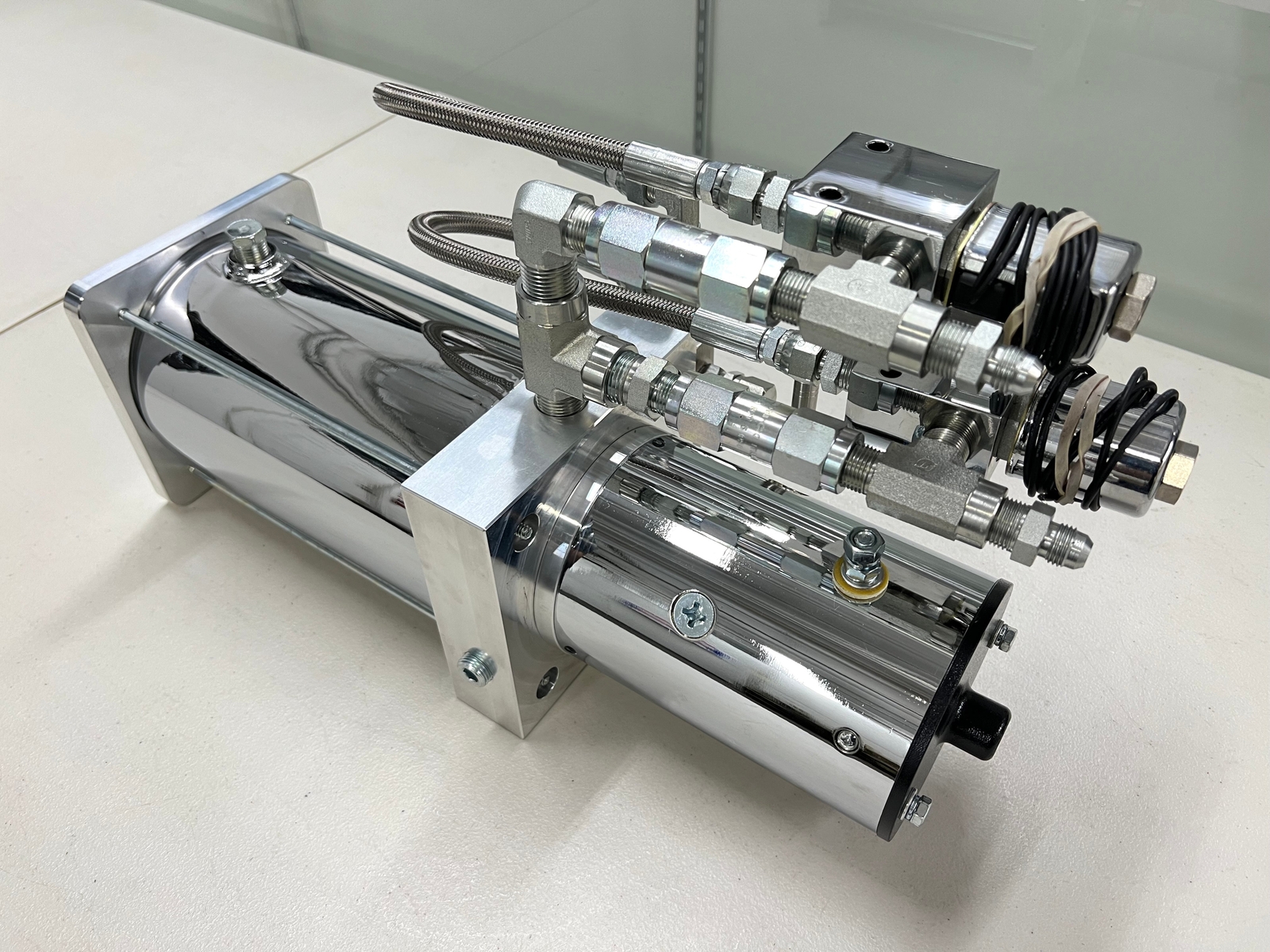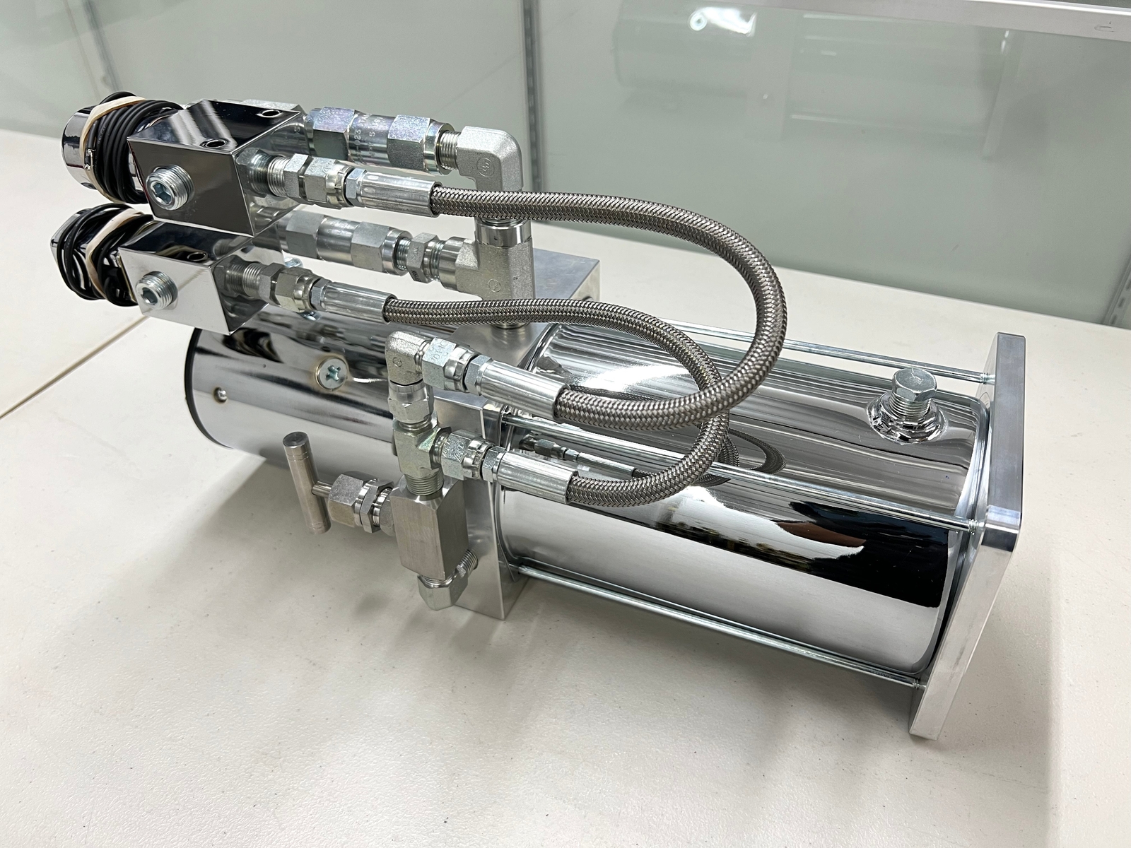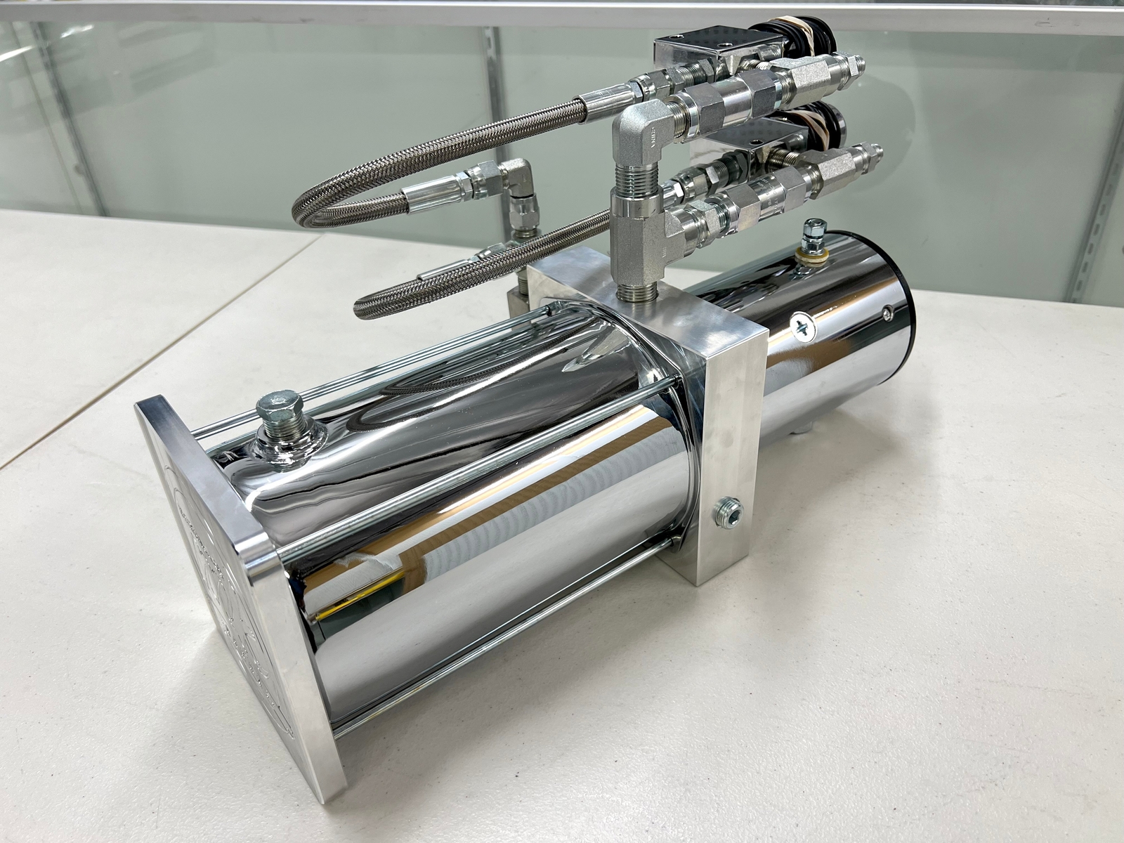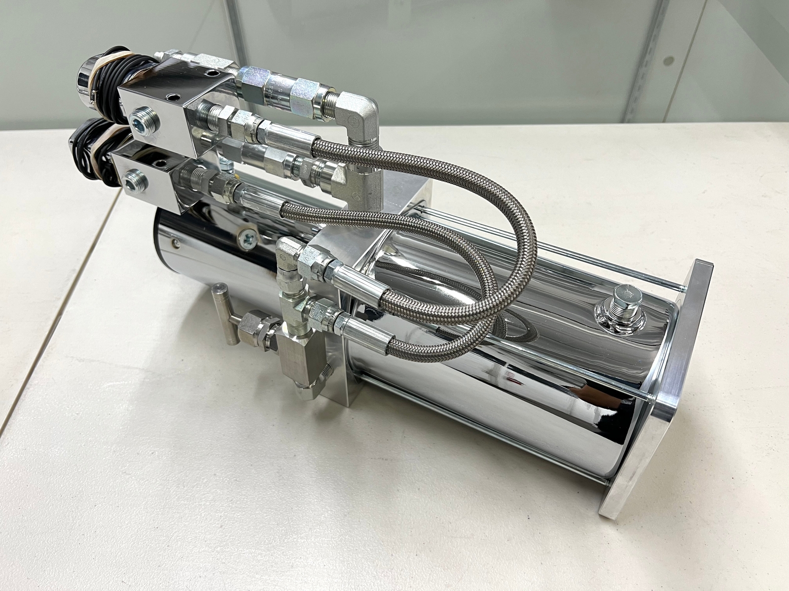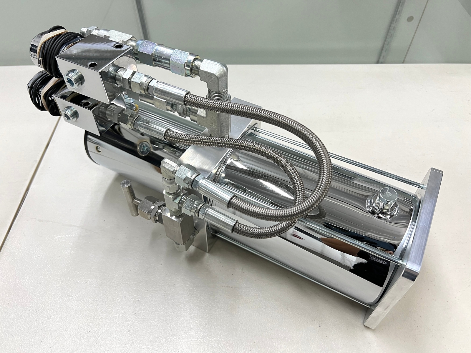 This 1 Pump kit with double dump fitting assembly kit features our MKG Signature Series Regular Fat block pumps , stucchi check valves , stainless steel T-handle slow down valves and steel braided return line and premium hydraulic fittings. What most companies would consider as an upgrade this is our standard.