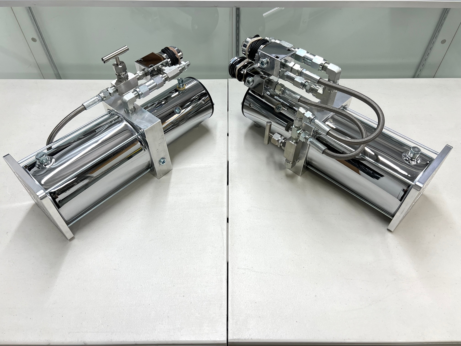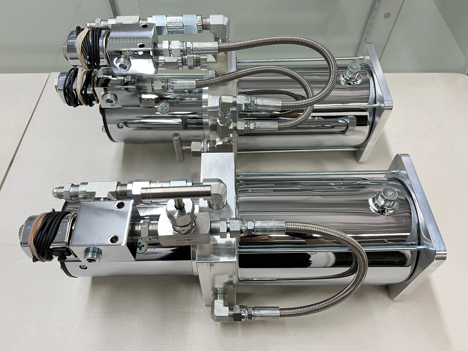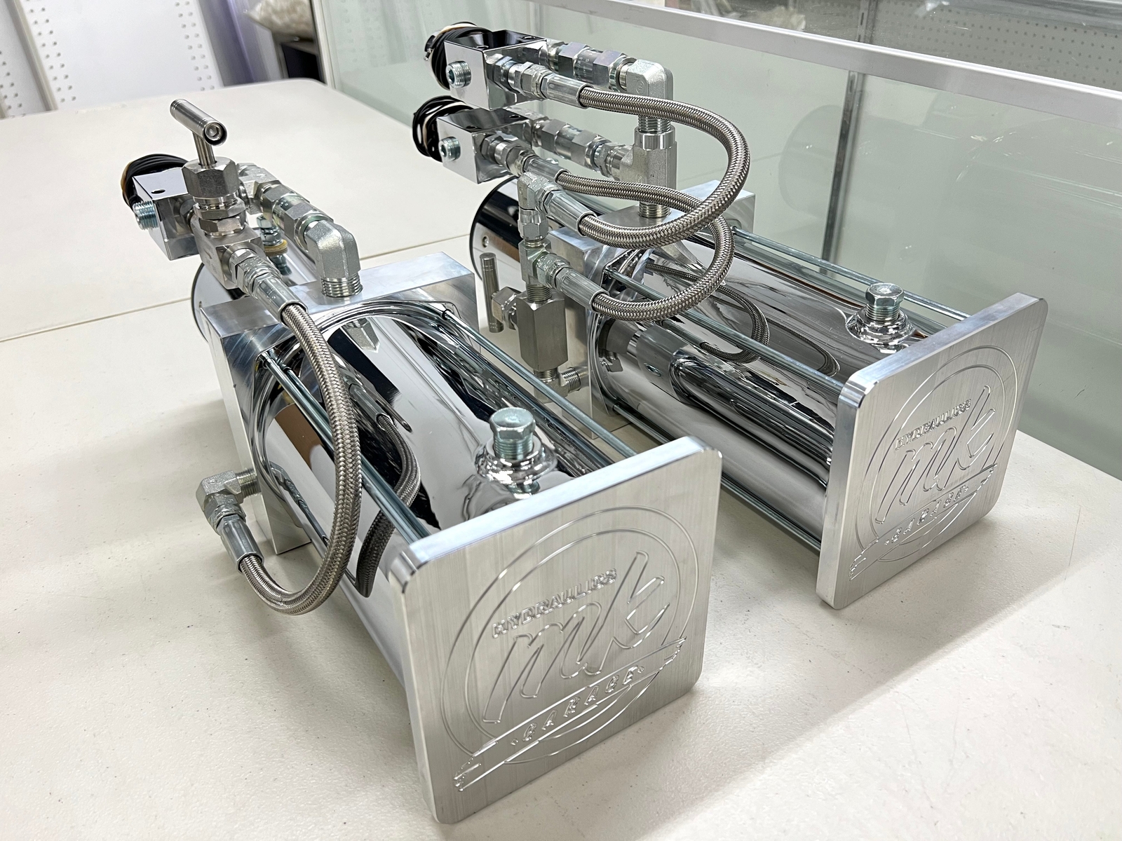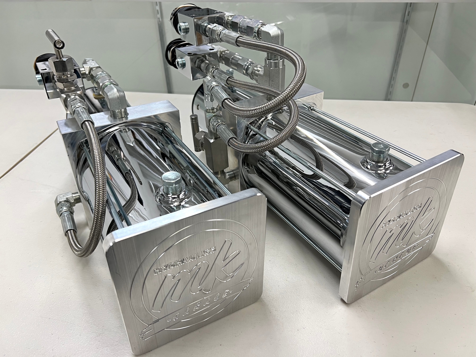 This 2 Pump Set with fitting assembly kit features our MKG Signature Series Regular Fat block pumps , stucchi check valves , stainless steel T-handle slow down valves and steel braided return line and premium hydraulic fittings. What most companies would consider as an upgrade this is our standard.