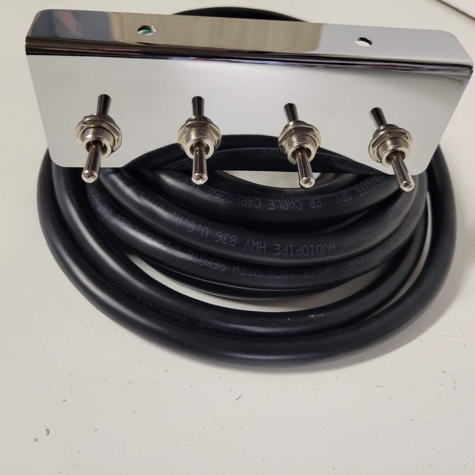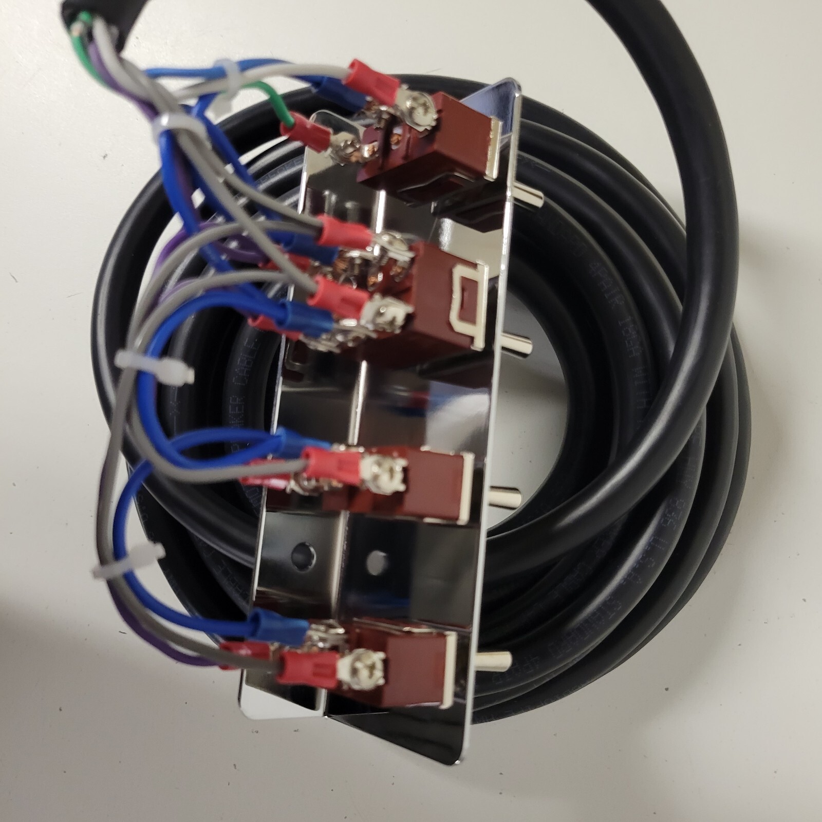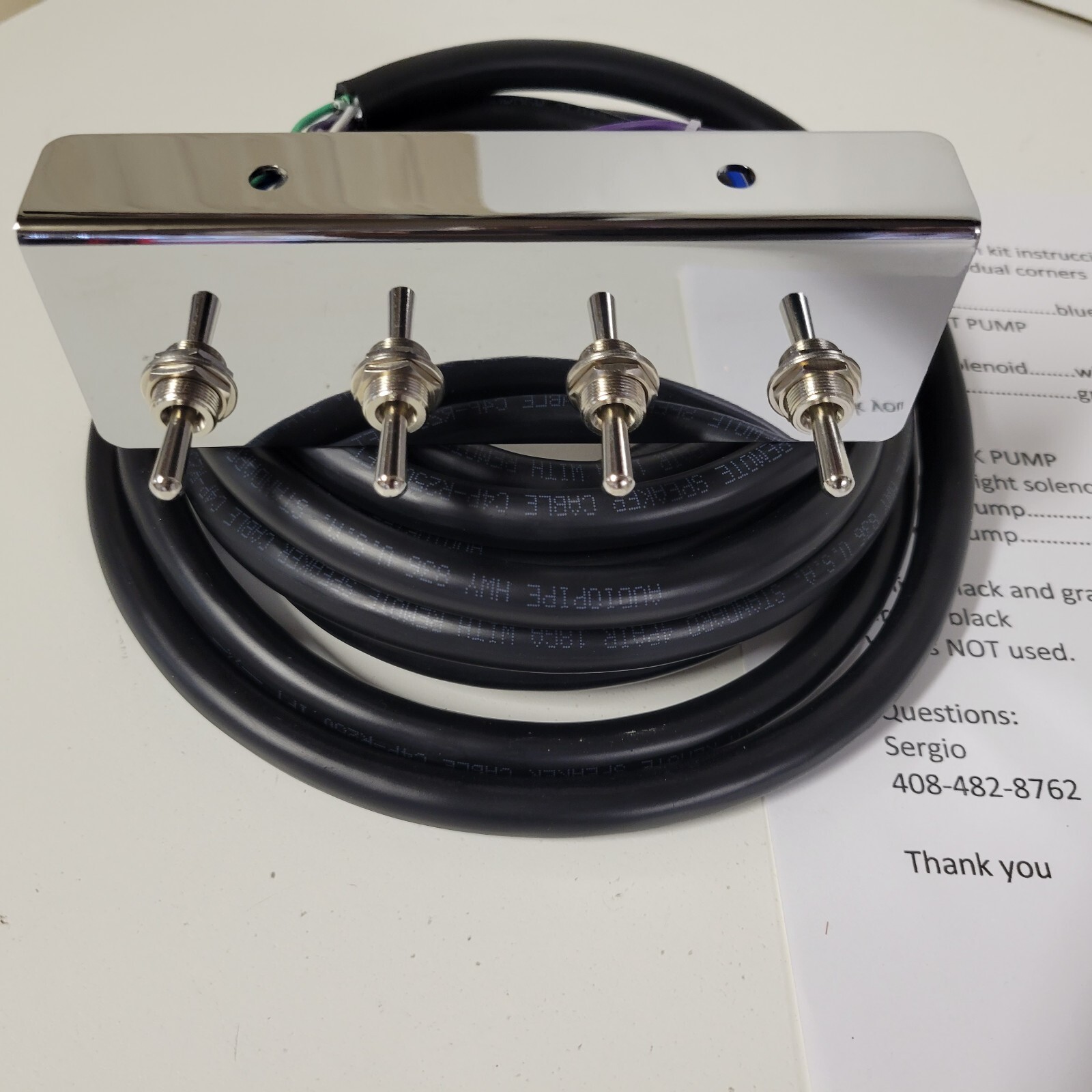 PRE WIRED switches with CHROME plate 1- 6 prong +3-3prong switches /.Switch cord 17 ft long 9 wire 18 g long cord.FRONT-BACK- back left – back right corners.wired for 3 pumps with 3 dumps.with instruccions. Comes with black switch cord.