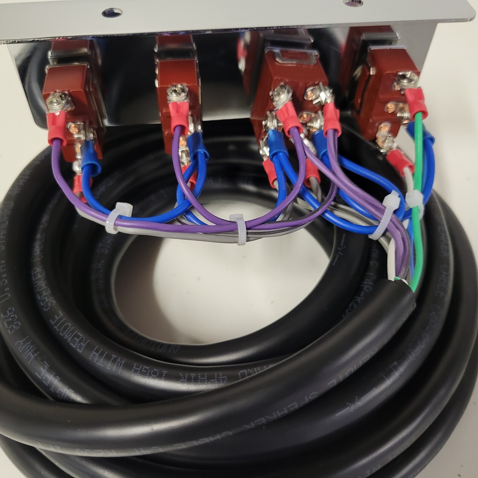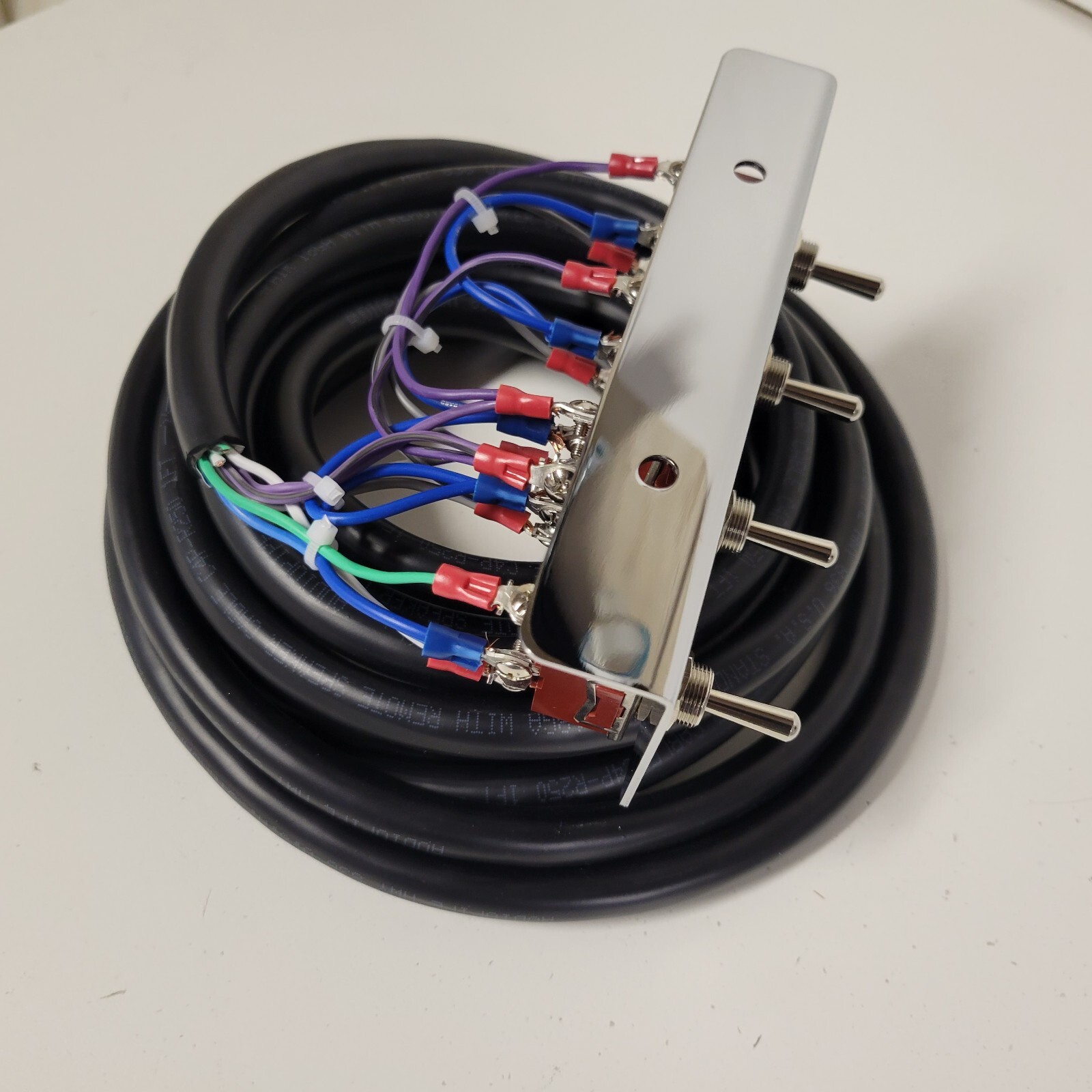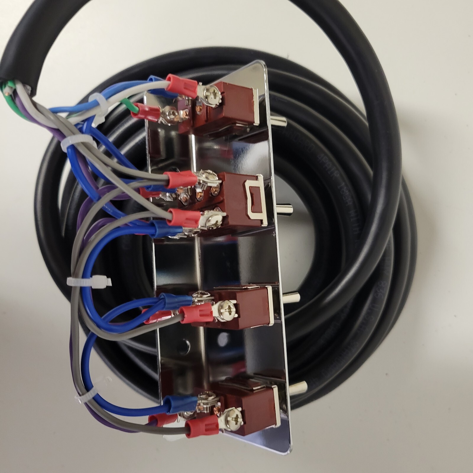 PRE WIRED switches with CHROME plate 1- 6 prong +3-3prong switches /.Switch cord 17 ft long 9 wire 18 g long cord.FRONT-BACK- back left – back right corners.wired for 3 pumps with 3 dumps.with instruccions. Comes with black switch cord.