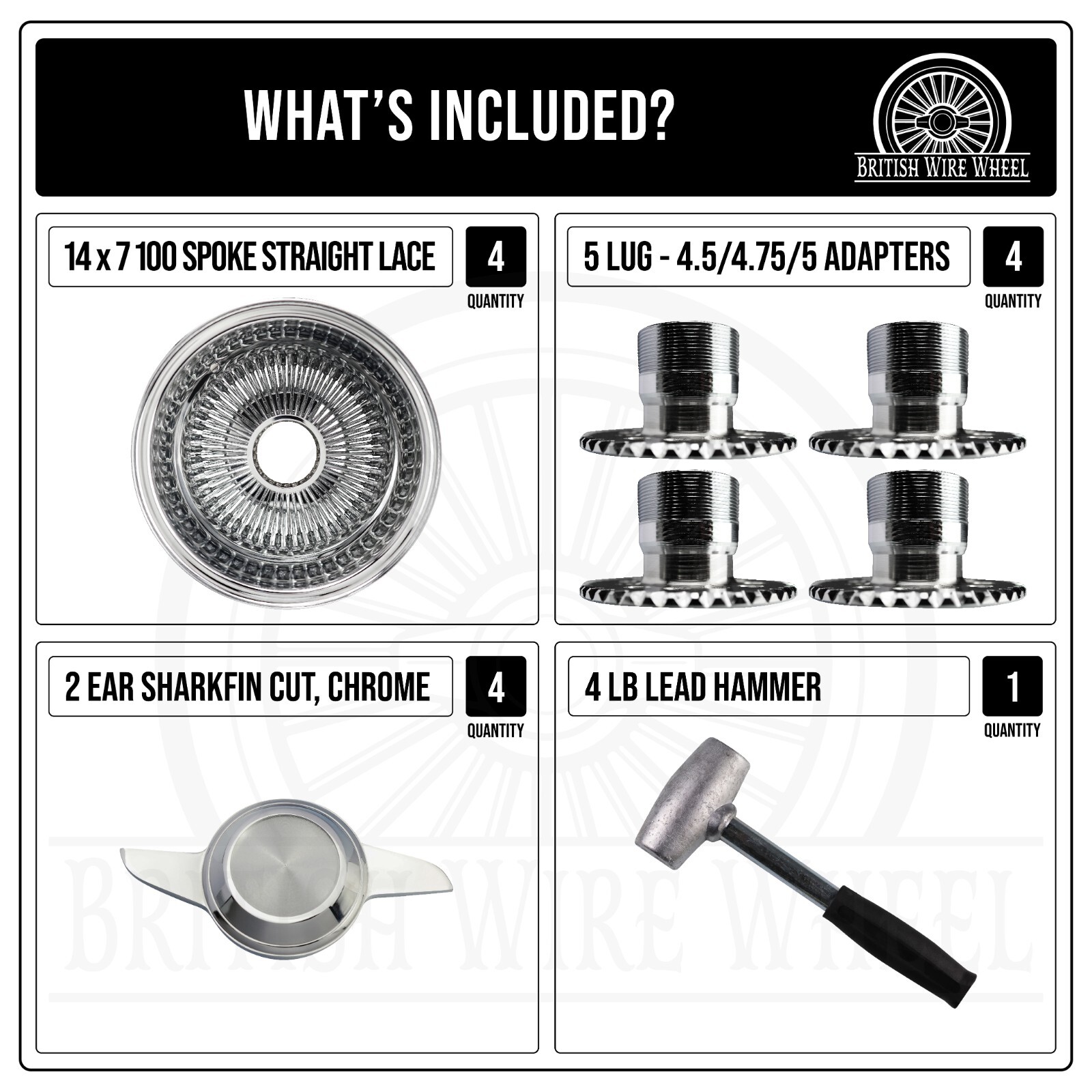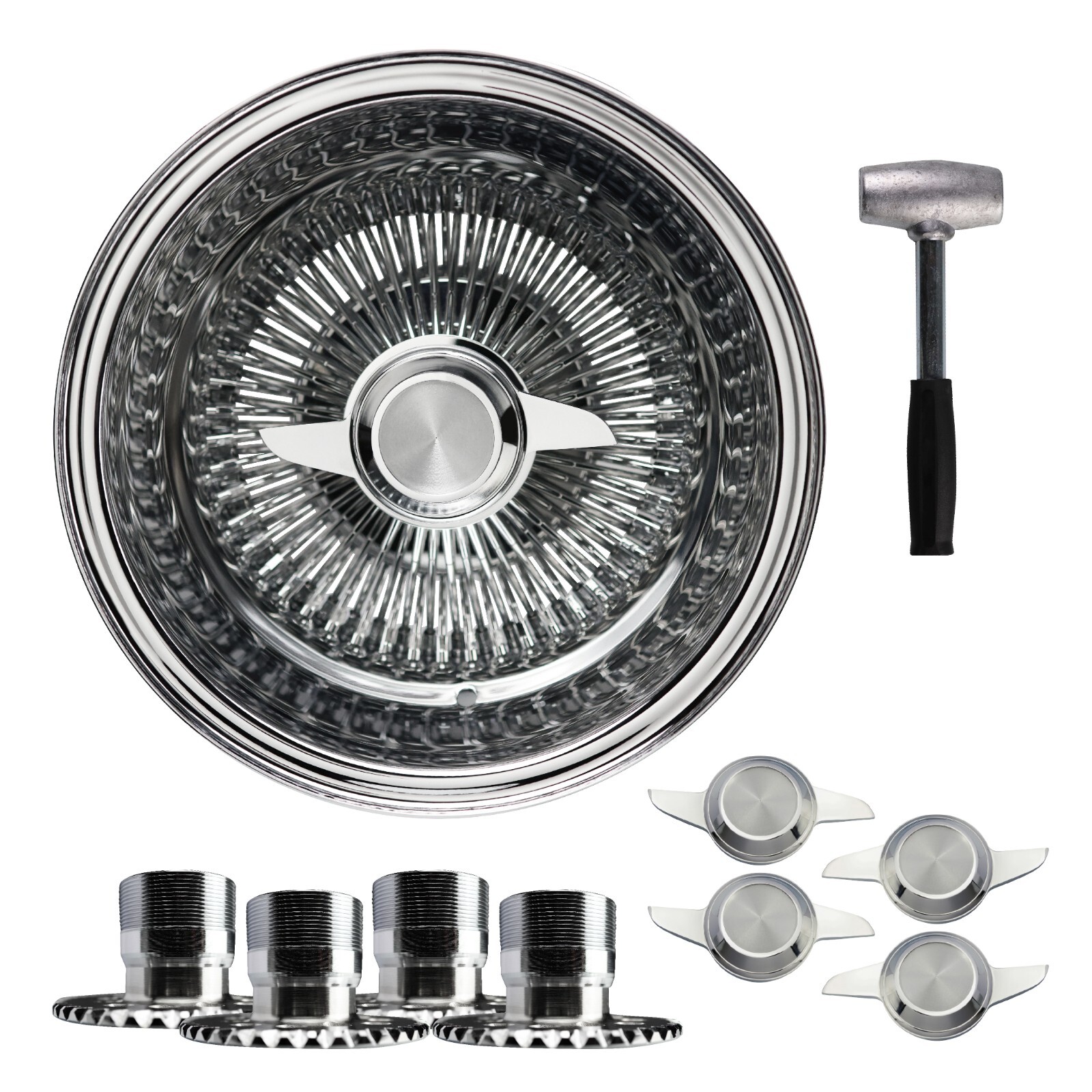 - (4) 14×7 Reverse 100 Spoke Stainless Steel Straight Lace Chrome Plated Knock Off Wire Wheels