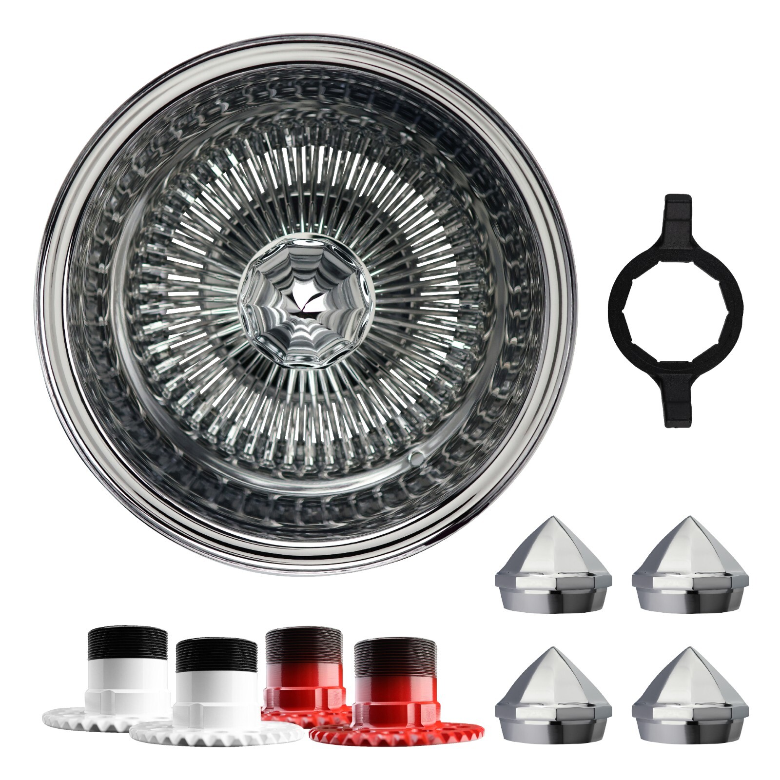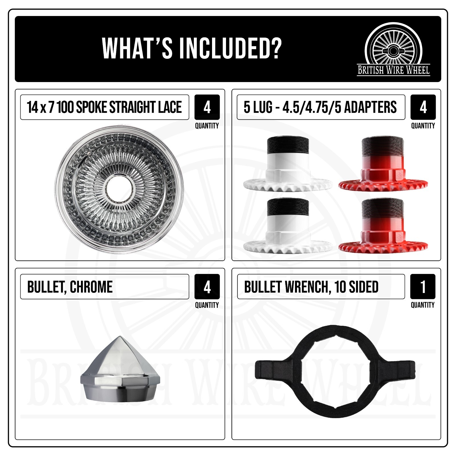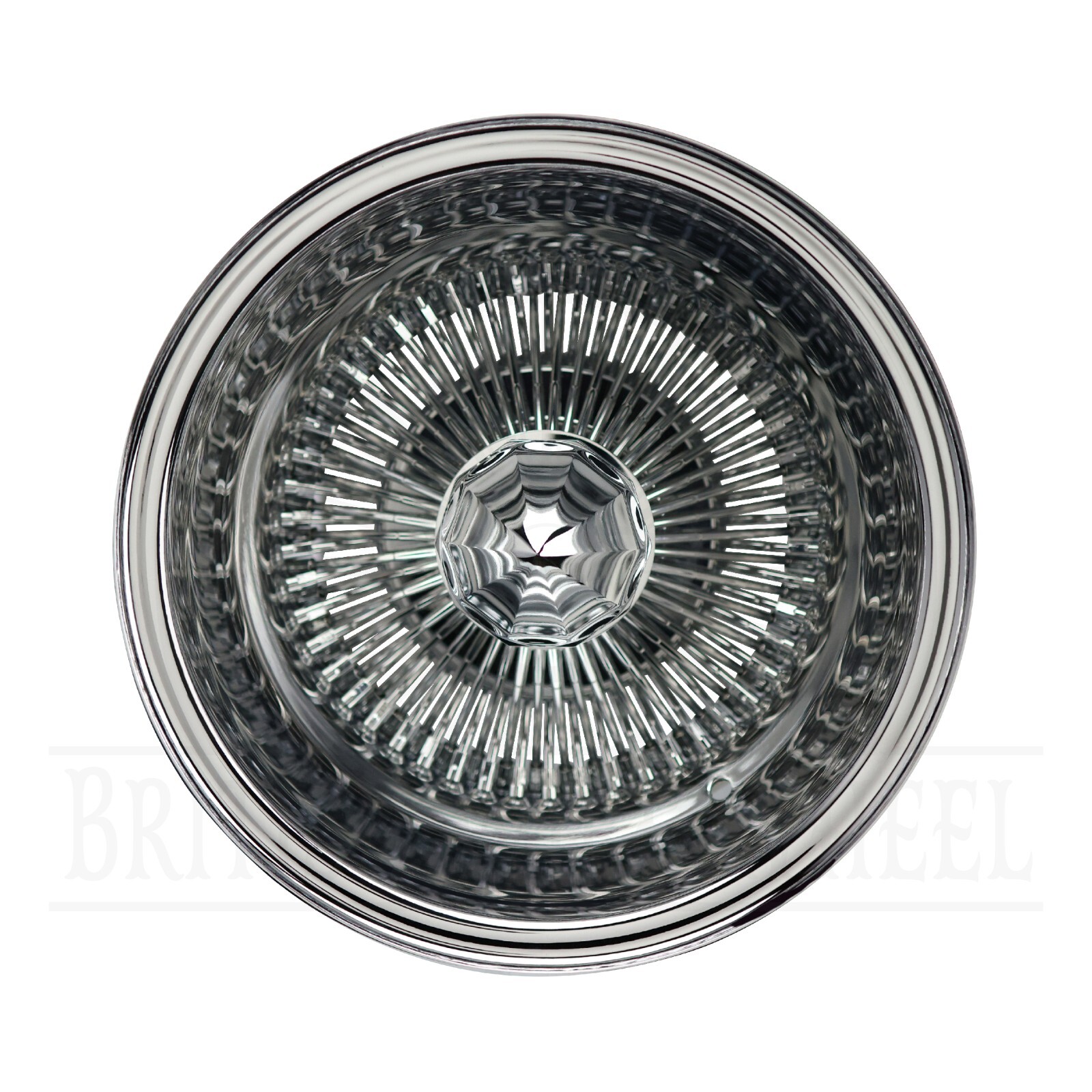 Introducing British Wire Wheel’s 14 x 7 Reverse 100 Spoke Straight Lace Wire Wheels with 10-sided Bullet/Diamond Spinner Caps. The wheels and knockoffs are triple chrome plated, providing a durable and stunning mirror-like finish. Designed to fit a wide range of vehicles, these wire wheels are a versatile choice for lowriders and classic car enthusiasts seeking a perfect blend of style and functionality.