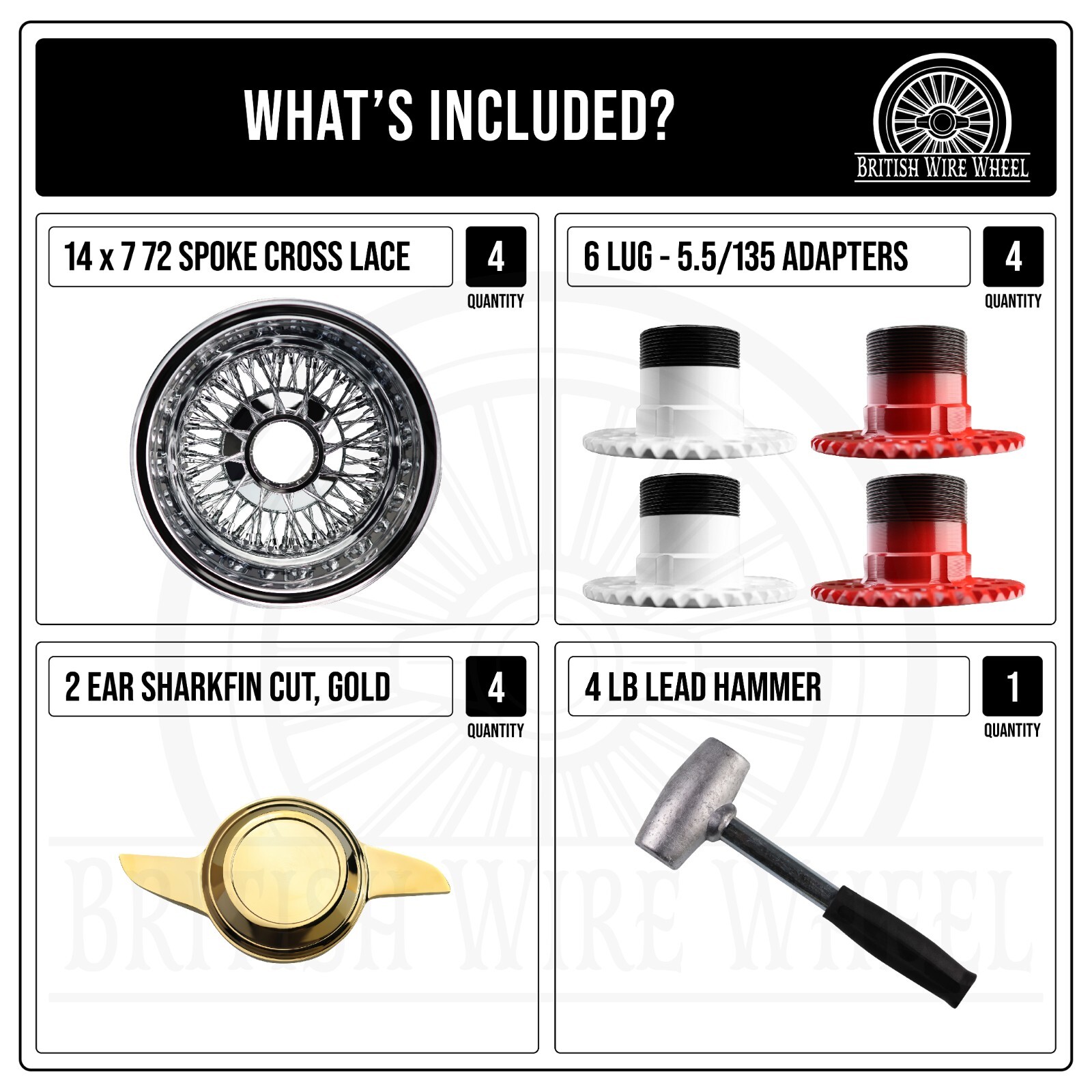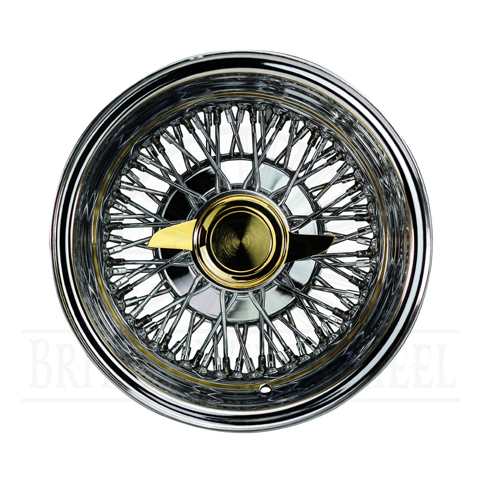 Introducing British Wire Wheel’s 14 x 7 Reverse 72 Spoke Cross Lace Wire Wheels with 2 Ear Swept/Sharkfin Style Cut Spinner Caps. The wheels are triple chrome plated, and the caps are 24K triple gold plated, providing a durable and stunning mirror-like finish. Designed to fit a wide range of vehicles, these wire wheels are a versatile choice for lowriders and classic car enthusiasts seeking a perfect blend of style and functionality.