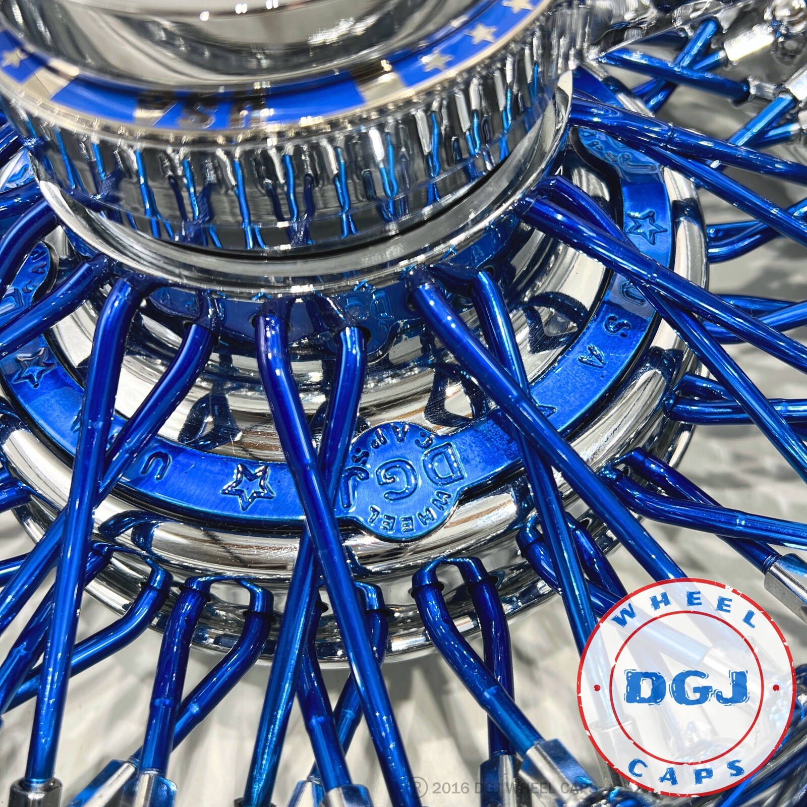 Home / Shop / Lowrider Accessories / Wheels / 14x7 / Dgj Wheel 14×7 Rev 72 Cross Lace Blue Spokes & Hub Ring Lowrider Wire Wheel Rims