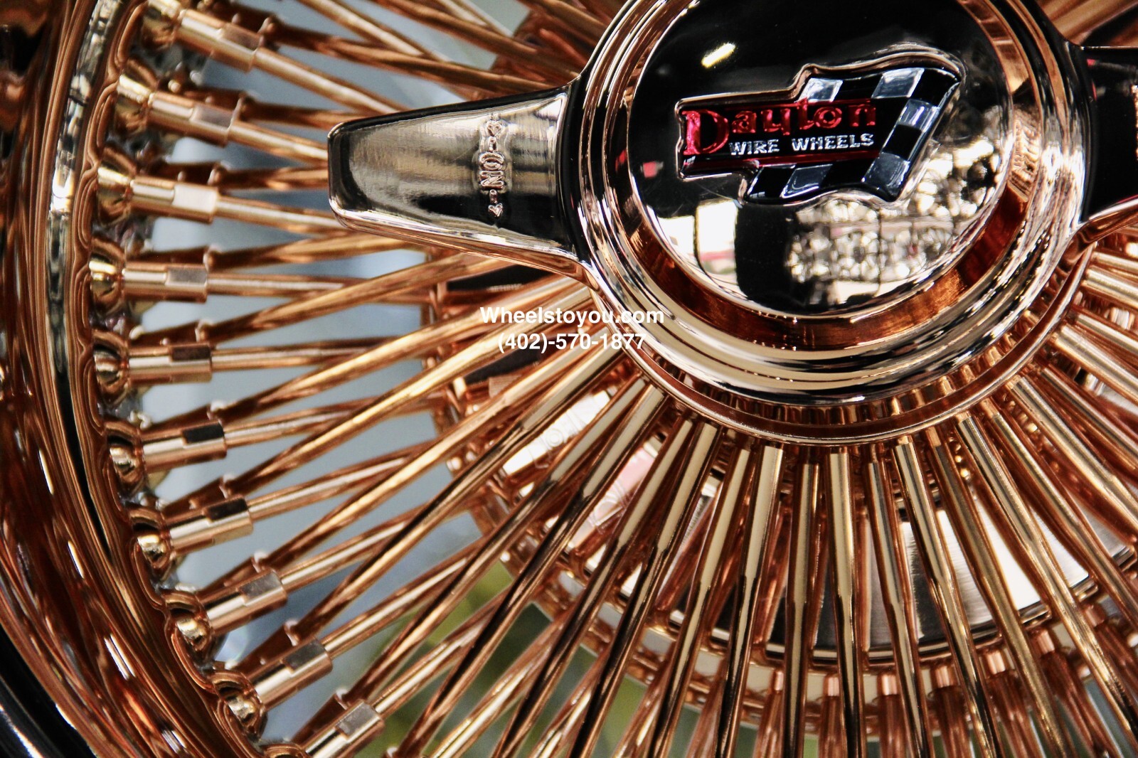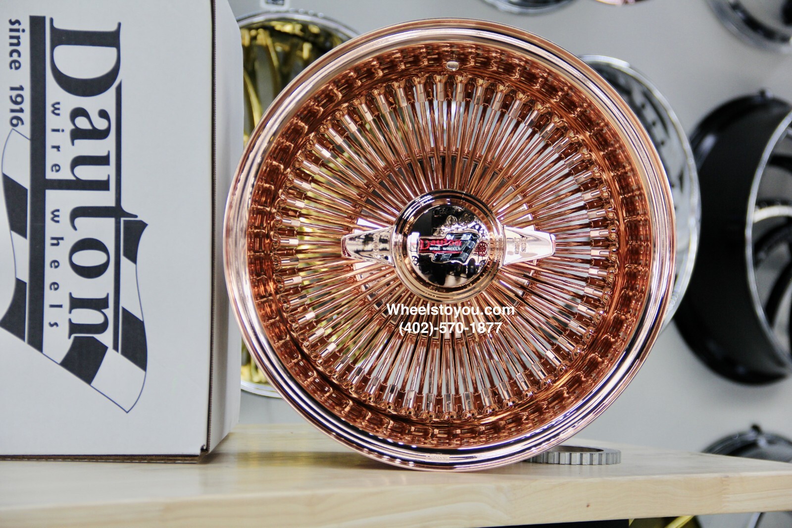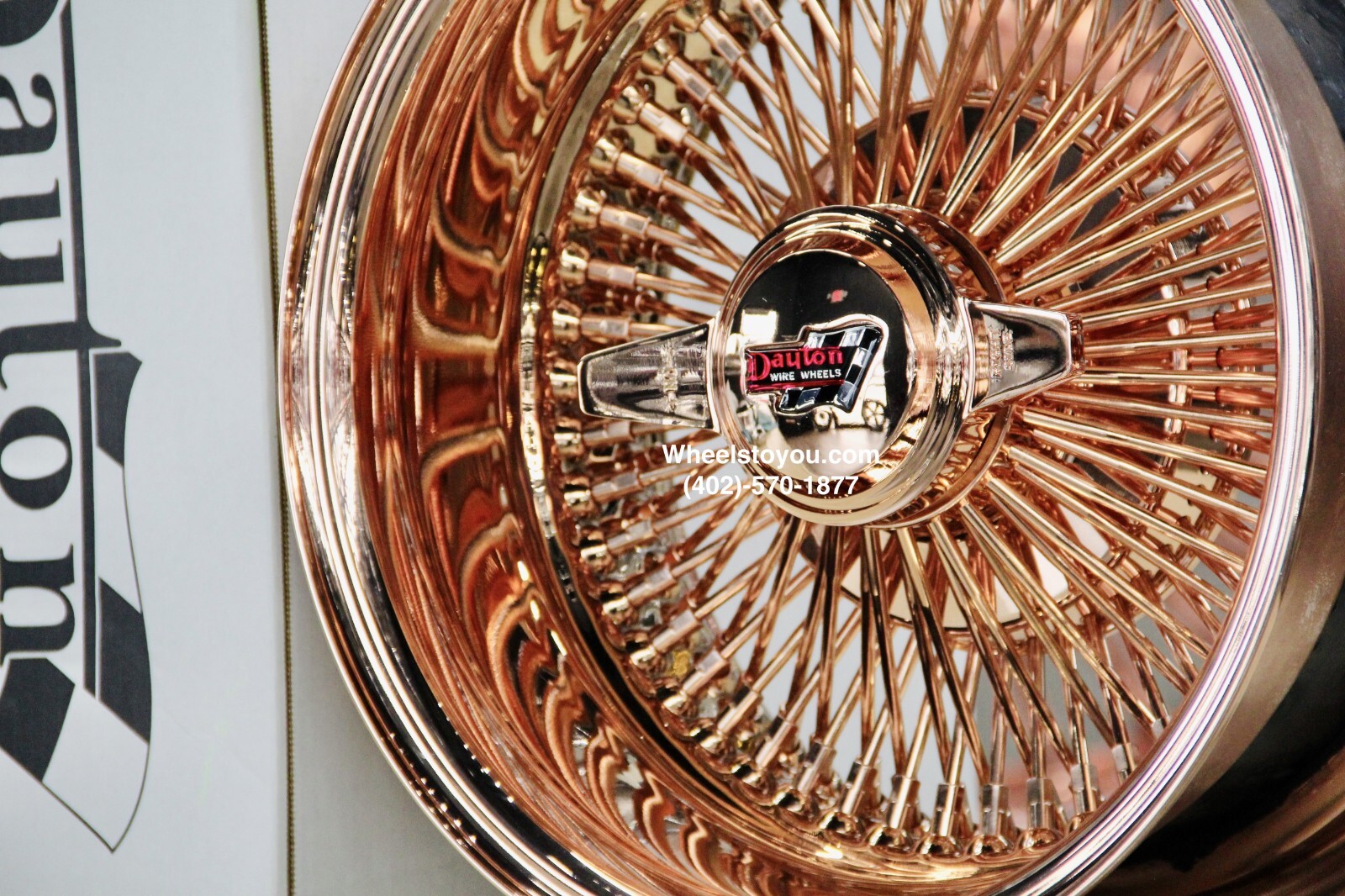 Home / Shop / Lowrider Accessories / Wheels / 14x7 / Rose Gold 24kt Genuine Dayton Stamped 14×7″ 100 Spoke Lowrider Wire Wheels New 4