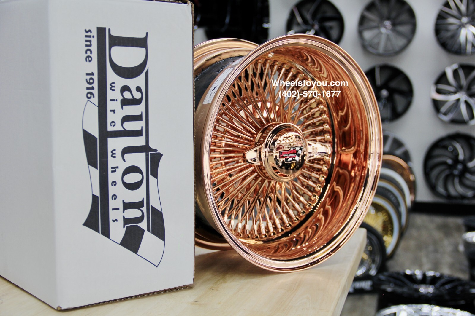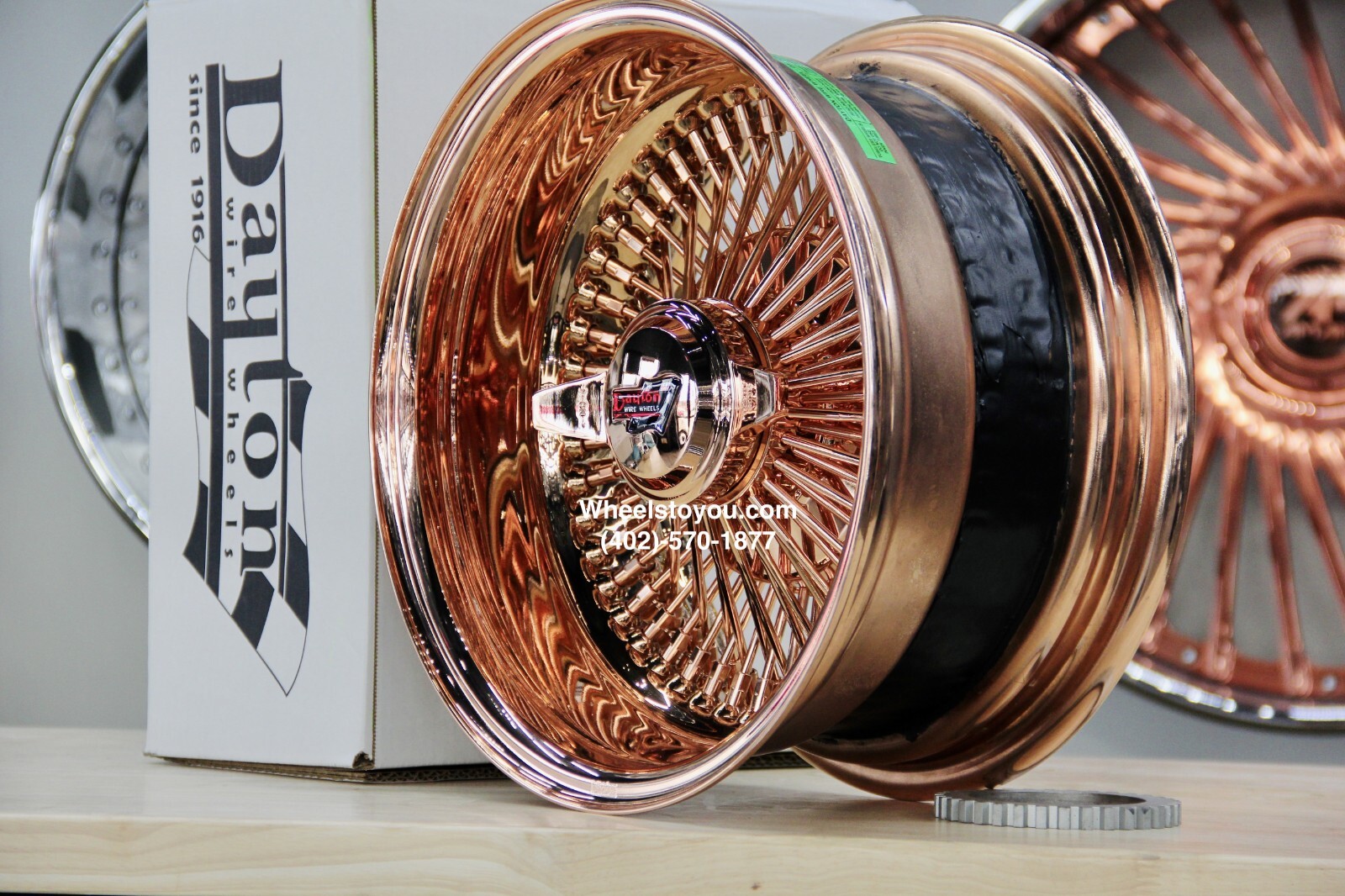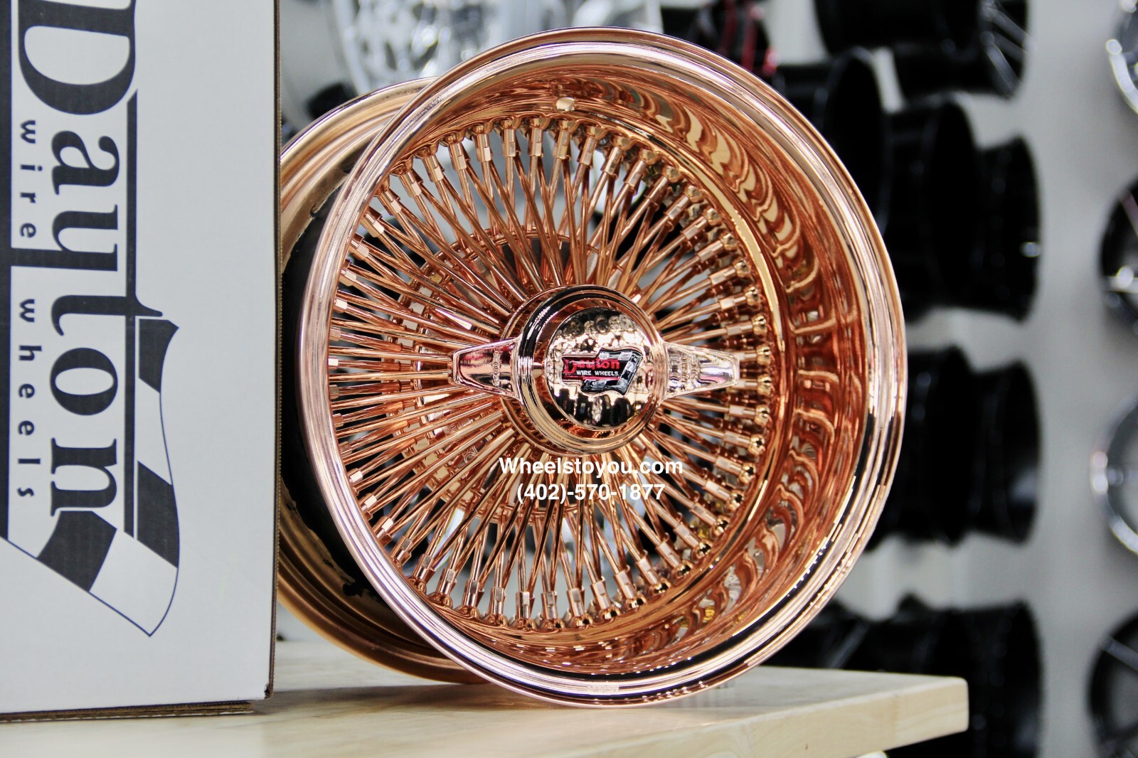 Home / Shop / Lowrider Accessories / Wheels / 14x7 / Rose Gold 24kt Genuine Dayton Stamped 14×7″ 100 Spoke Lowrider Wire Wheels New 4
