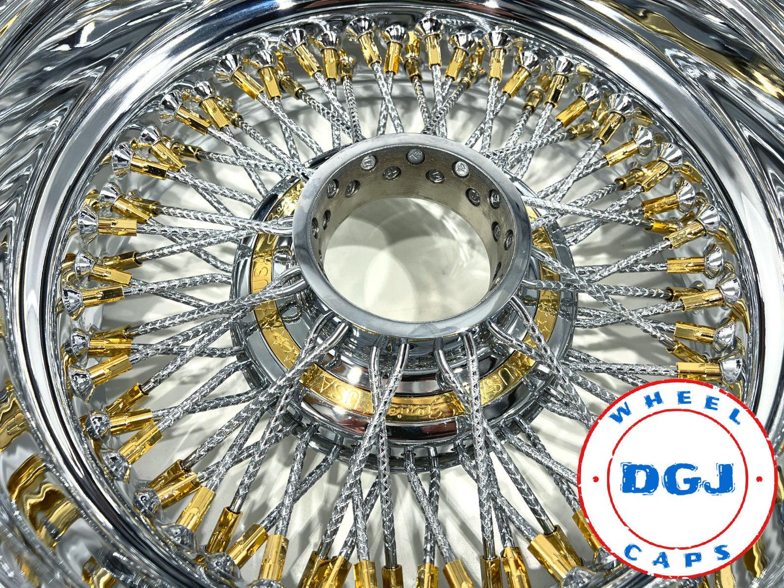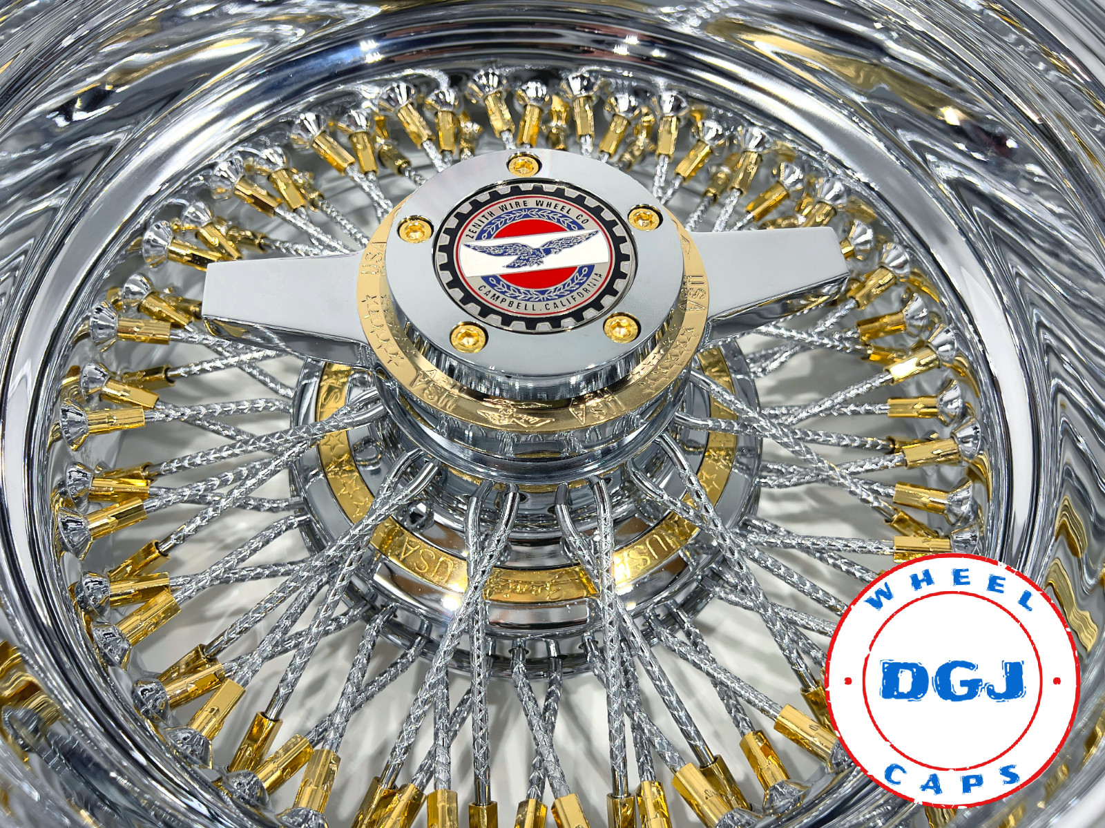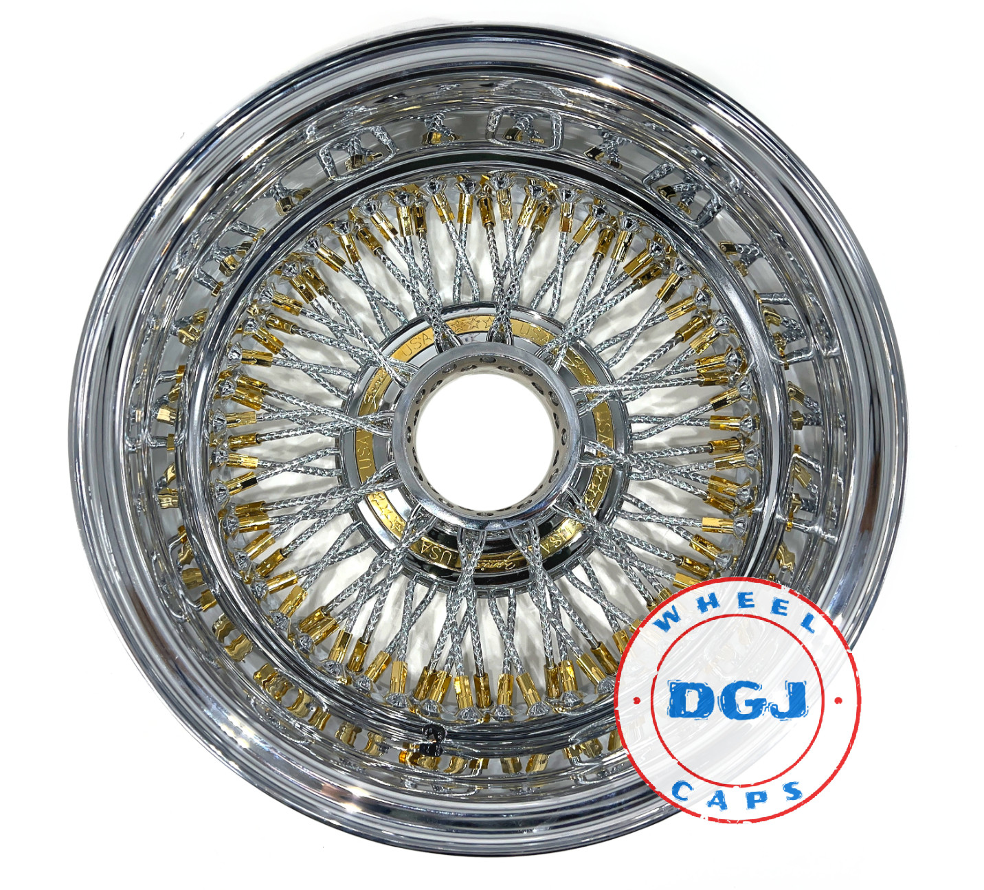 Home / Shop / Lowrider Accessories / Wheels / 14x7 / Zenith Style 14×7 Rev 72 Diamond Spokes Gold Nip+hub Ring Lowrider Wire Wheels
