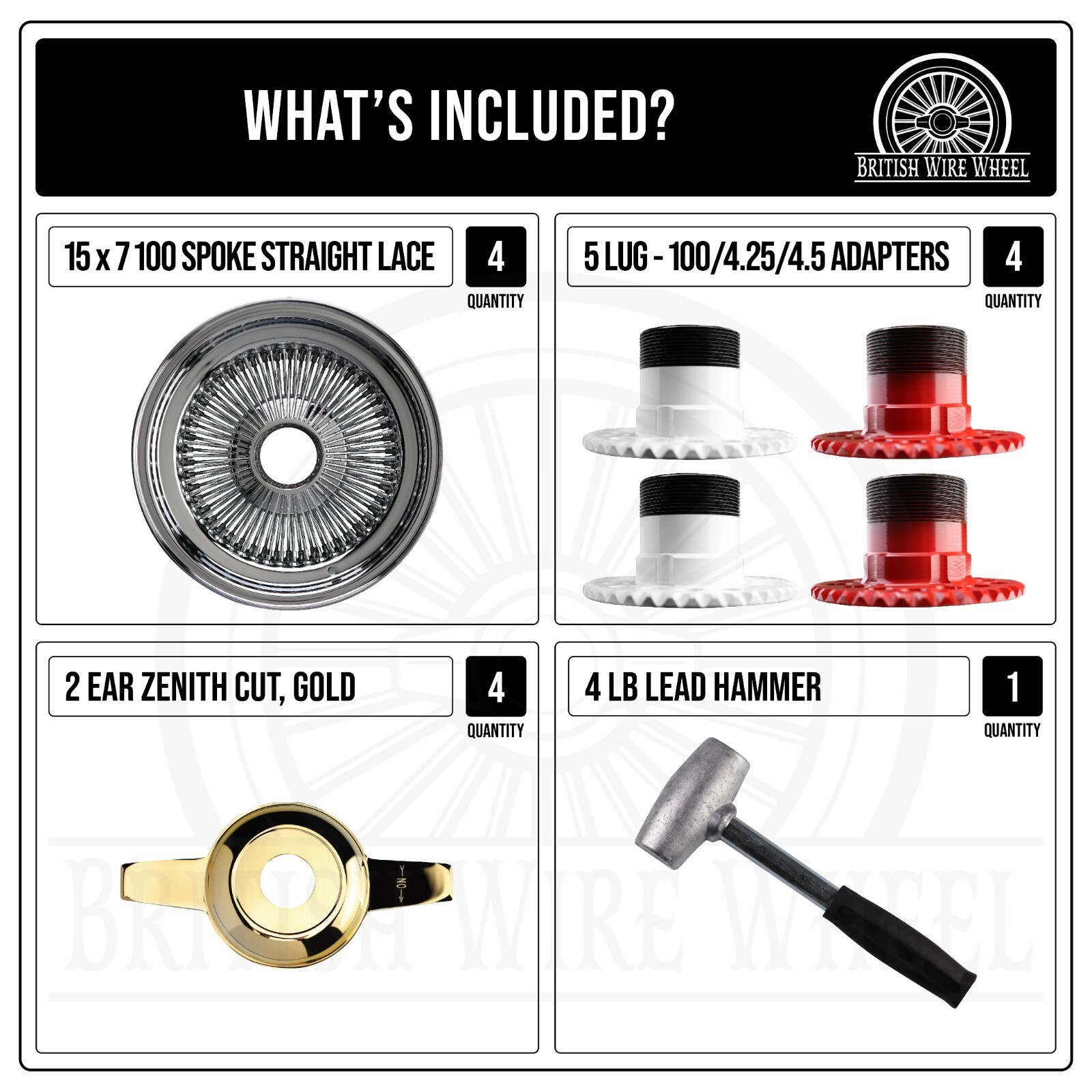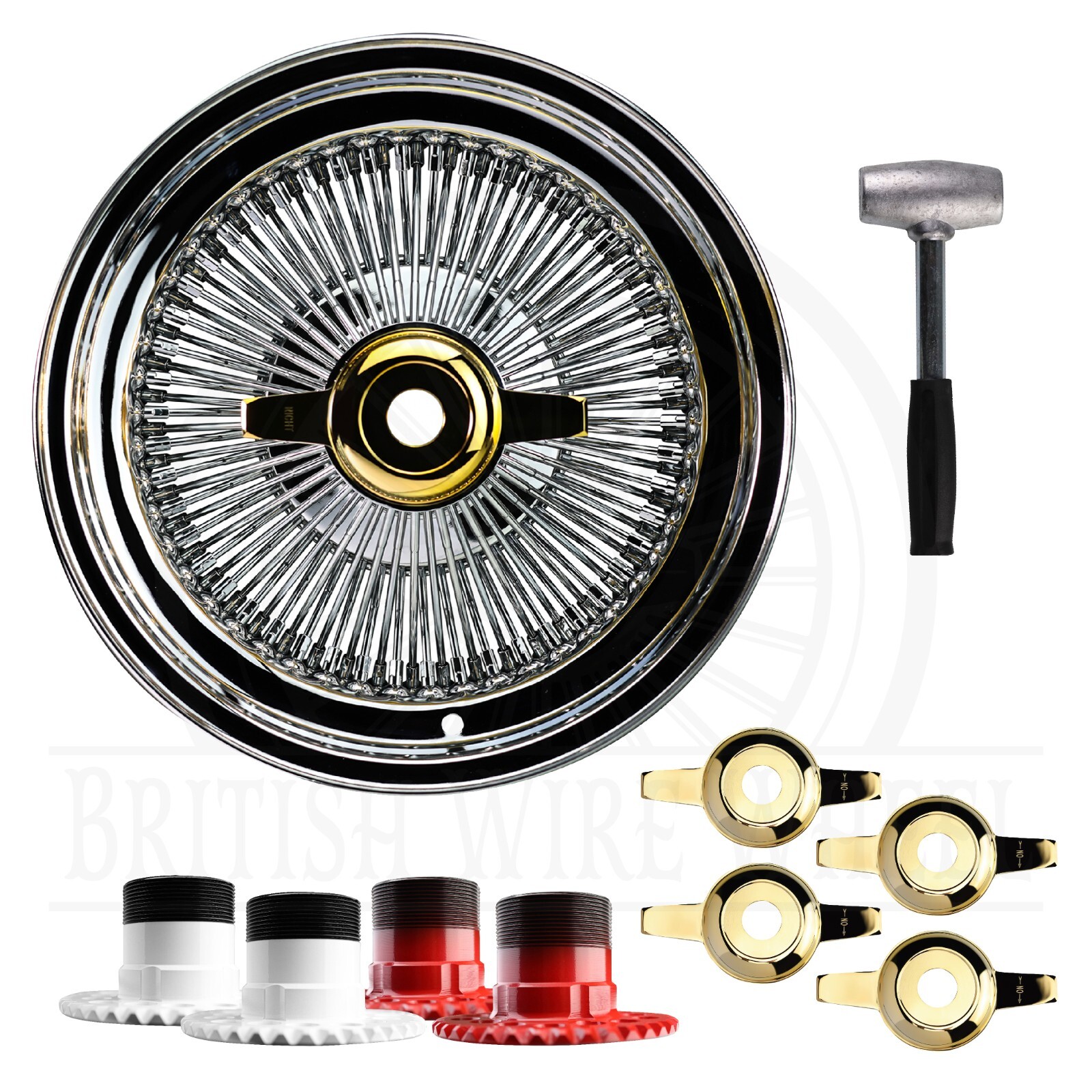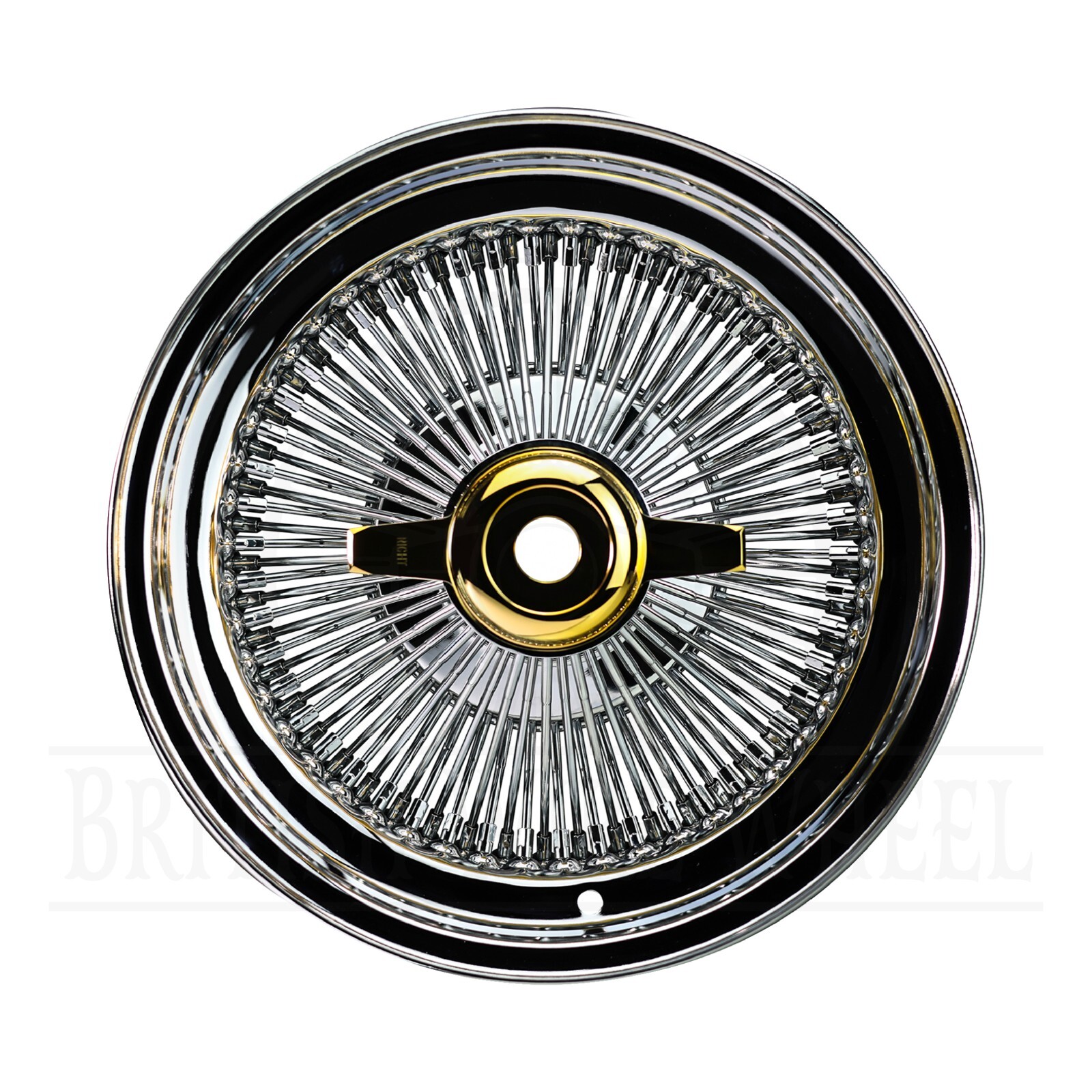 Introducing British Wire Wheel’s 15 x 7 Standard 100 Spoke Straight Lace Wire Wheels with Zenith Style 2 Bar Straight Cut Spinner Caps. The wheels are triple chrome plated, and the caps are 24K triple gold plated, providing a durable and stunning mirror-like finish. Designed to fit a wide range of vehicles, these wire wheels are a versatile choice for lowriders and classic car enthusiasts seeking a perfect blend of style and functionality.