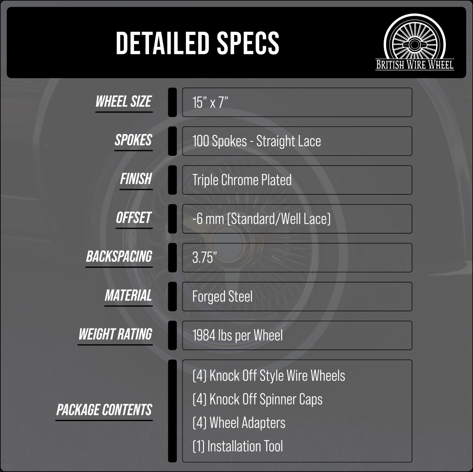 - (4) 15×7 Standard 100 Spoke Straight Lace Triple Chrome Plated Knock Off Wire Wheels